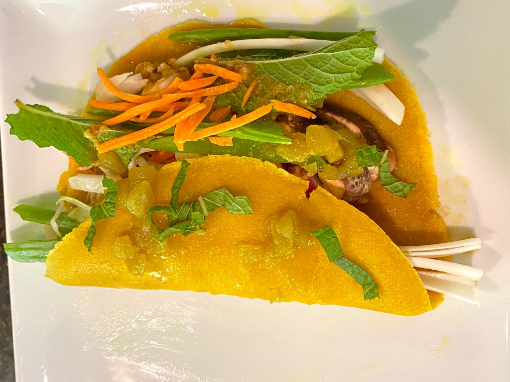 My wife Alex loved the way this “Banh xeo” looked in the book: a Vietnamese pancake with fresh herbs and vegetables stuffed in it, so we decided to give it a shot!