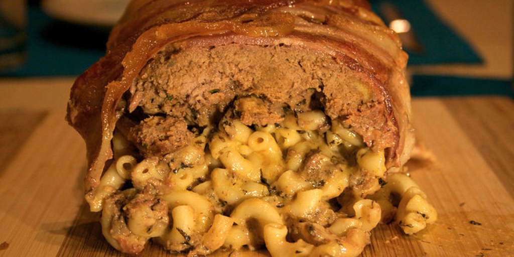 Now that I have suitably terrified you, let me at least offer up a few ways to maximize your “mac’n’cheese enjoyment” – how about a “bacon-wrapped, mac’n’cheese-stuffed Meatloaf?