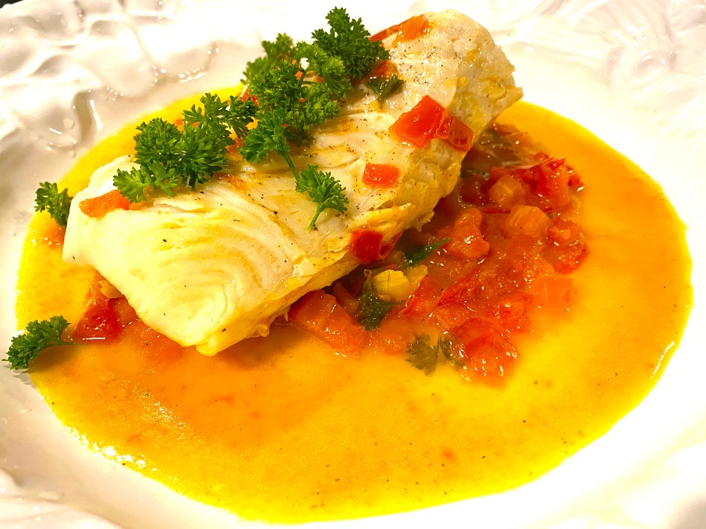 Lay some sauce and tomatoes on the bottom of your plate and lay the fish on top, with some fresh parsley as well…that’s it!