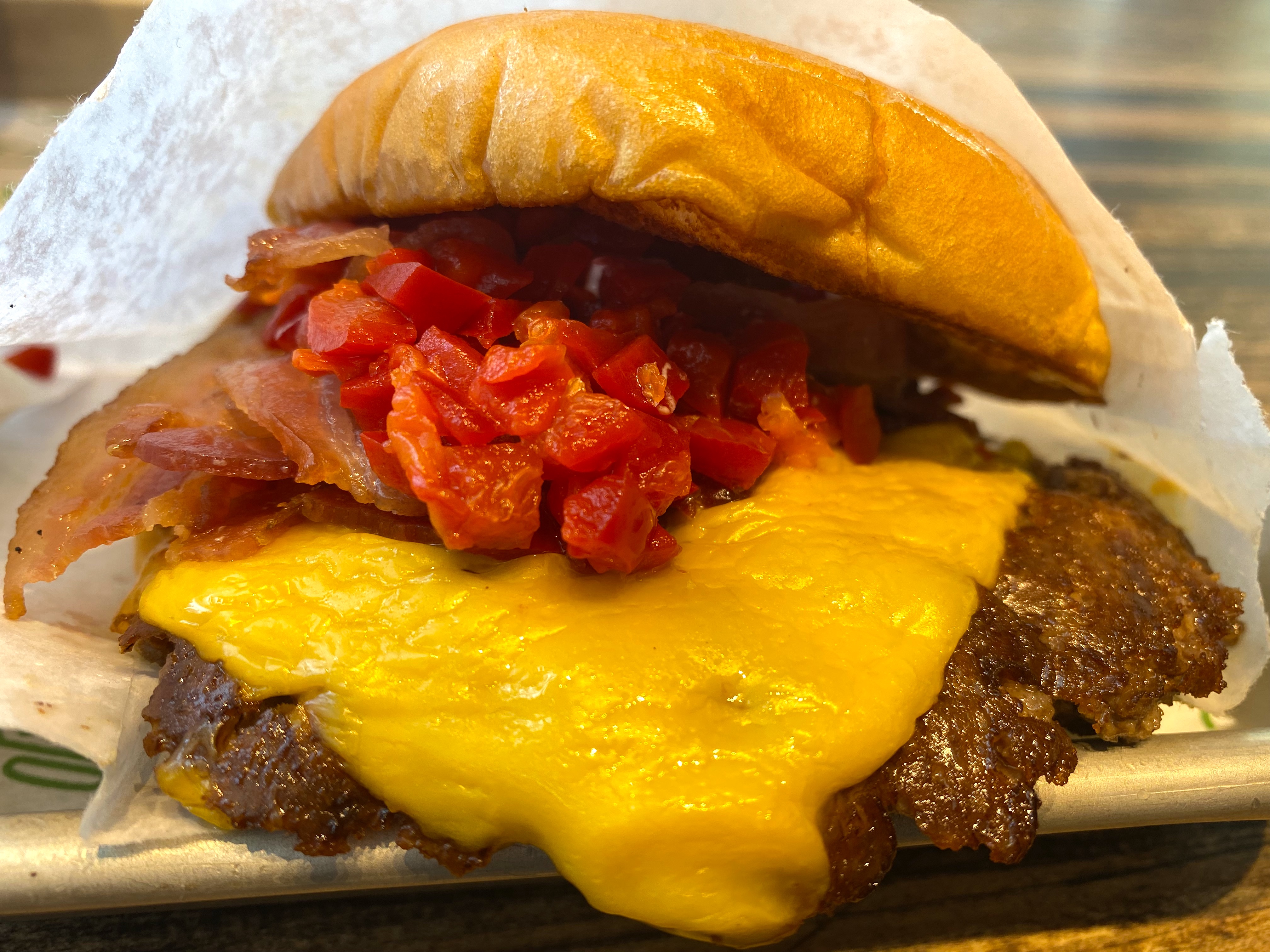 I usually opt for this version. It’s where you begin to see their approach to a burger: it’s a cheeseburger topped with TONS of all-natural applewood smoked bacon, plus a slightly spicy chopped cherry peppers and their signature shack sauce – oh, and did I say TONS OF BACON?
