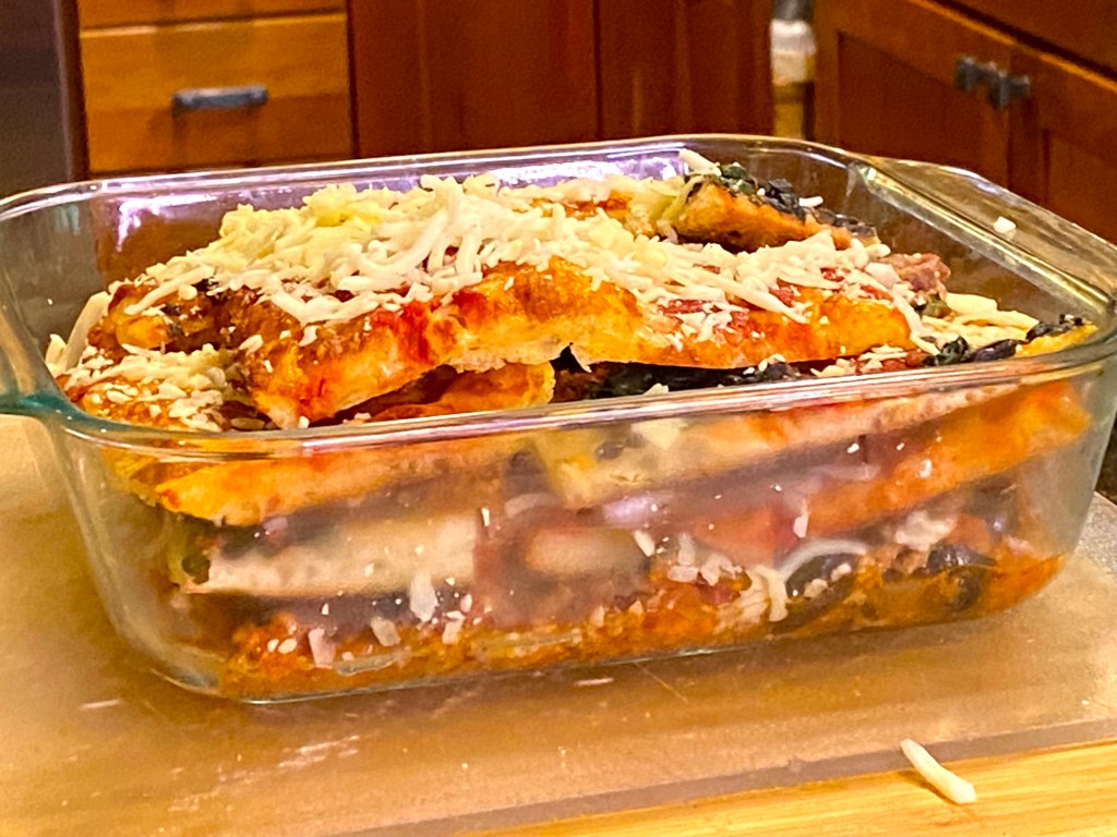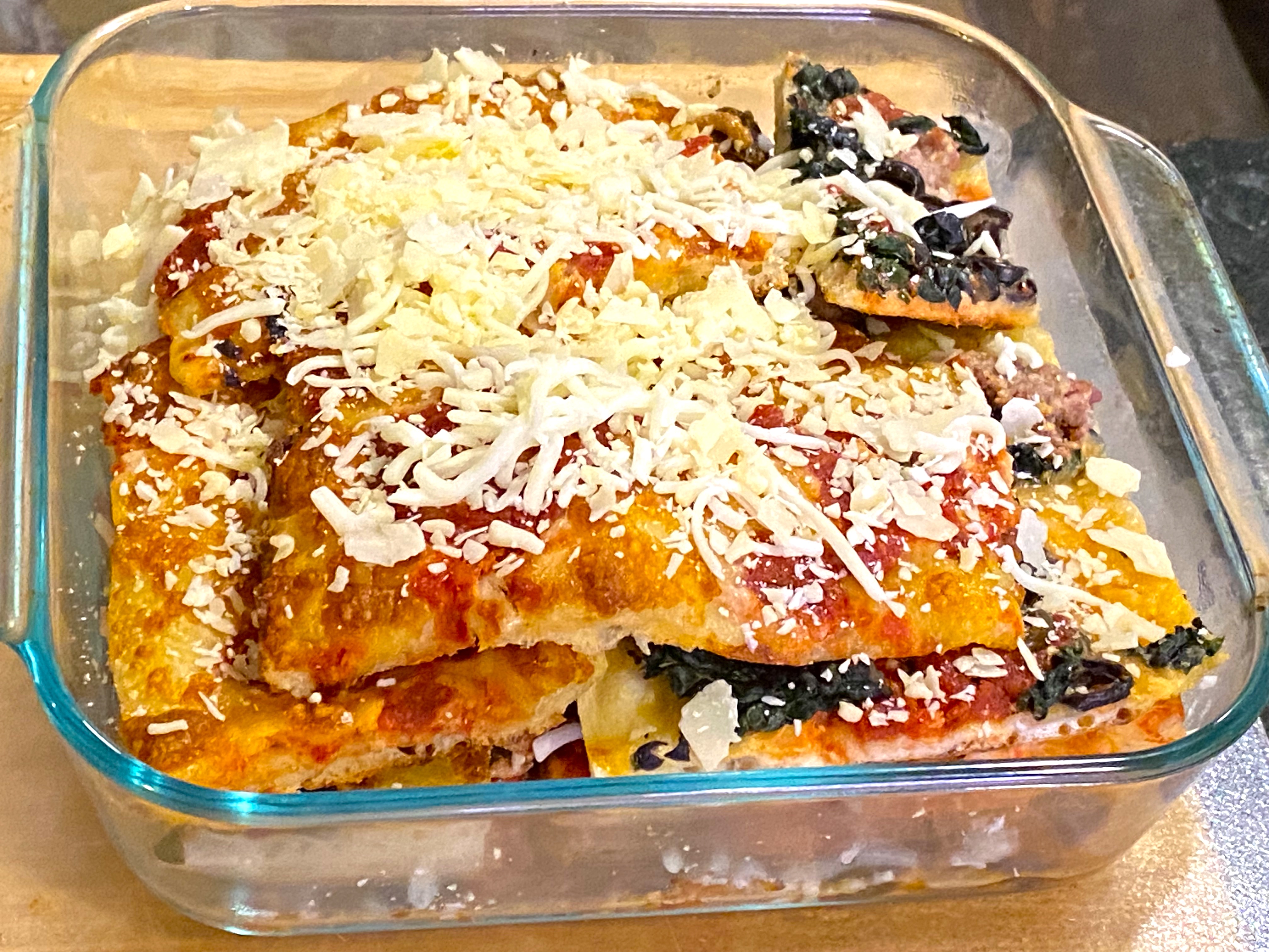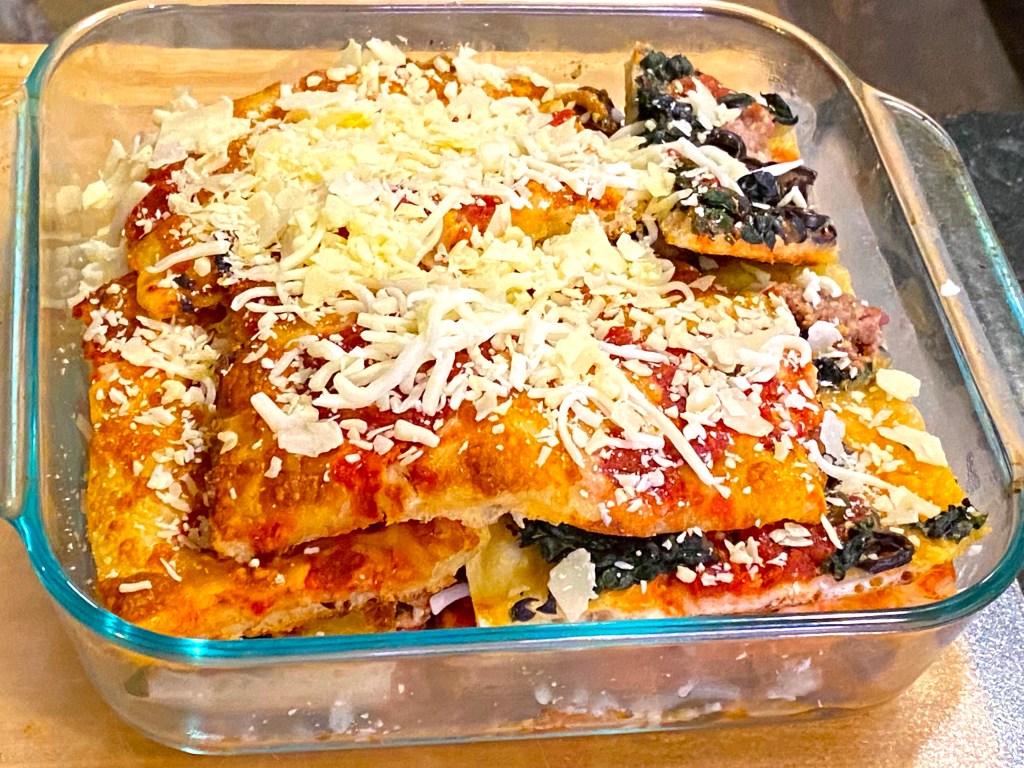 If you watched the video, you saw that I found these leftover ingredients in the refrigerator, and it struck me:  the thin pizza slices looked like lasagna noodles…so what if I formed and trimmed these pieces and made a lasagna out of them, with the slices layered like noodles?