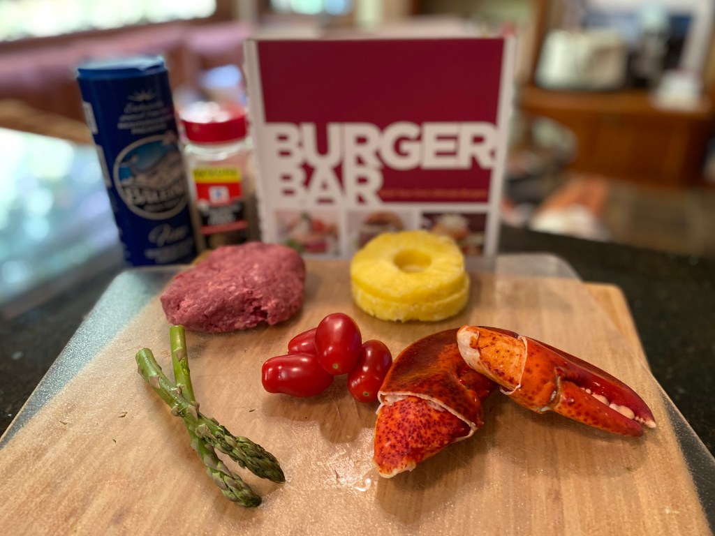 First, look at these ingredients,…hamburger. ASPARAGUS. Cherry tomatoes. LOBSTER. And PINEAPPLE.