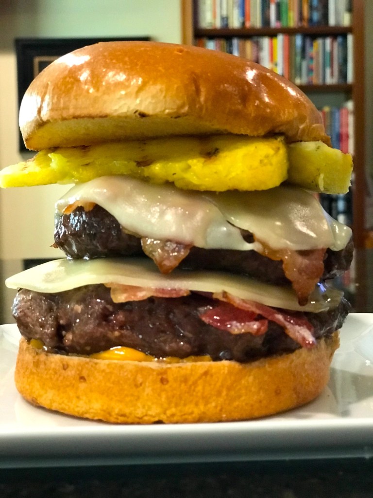 As you can see, the “double patty double bacon and double cheese” strategy makes for a big mouthful, but I think it’s necessary, because the grilled pineapple has a ton of flavor! It’s sweetness is nicely counter-balanced by the Sriracha sauce, leaving me with a very satisfying taste!