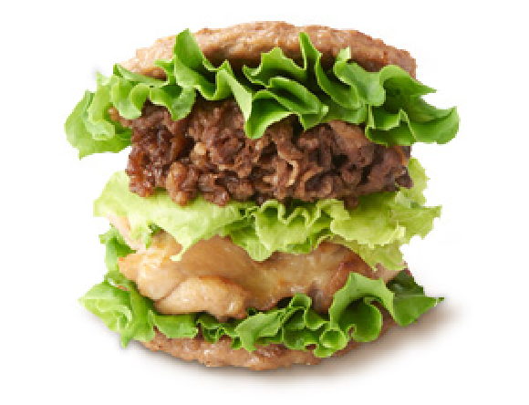 “Next comes a leaf of lettuce to keep the beef bun separate from the teriyaki chicken, more lettuce, a generous helping of yakiniku beef, one last lettuce layer, and, finally, yet another hamburger patty to top the whole thing off, making the Niku Niku Niku Burger actually four servings of meat.”