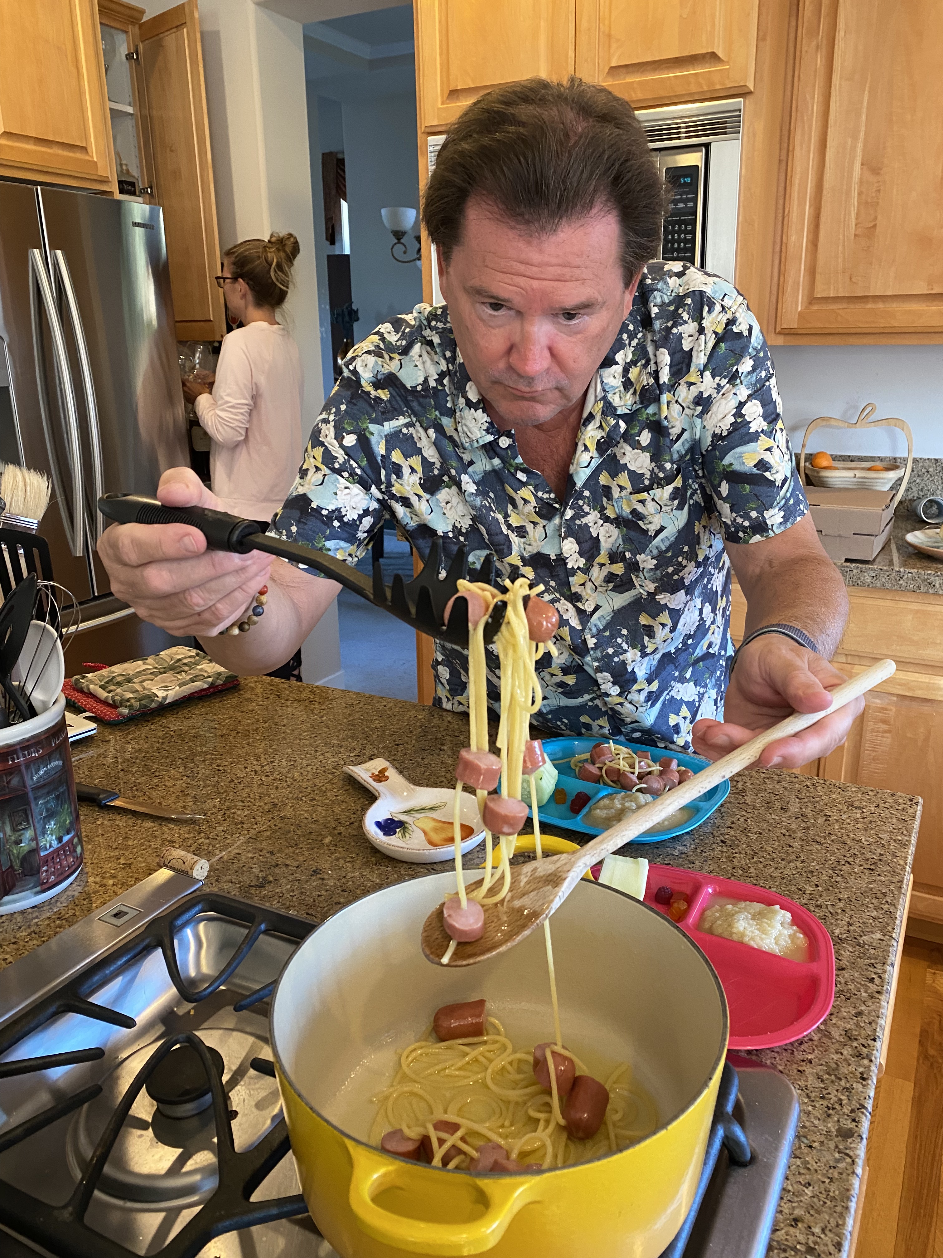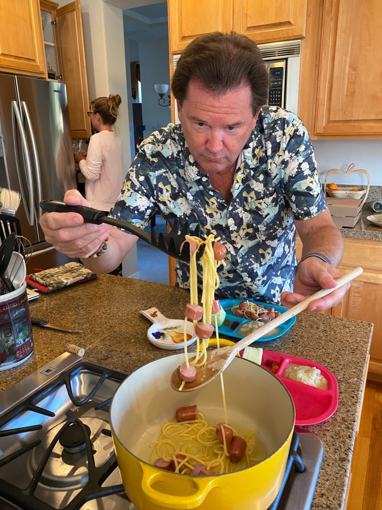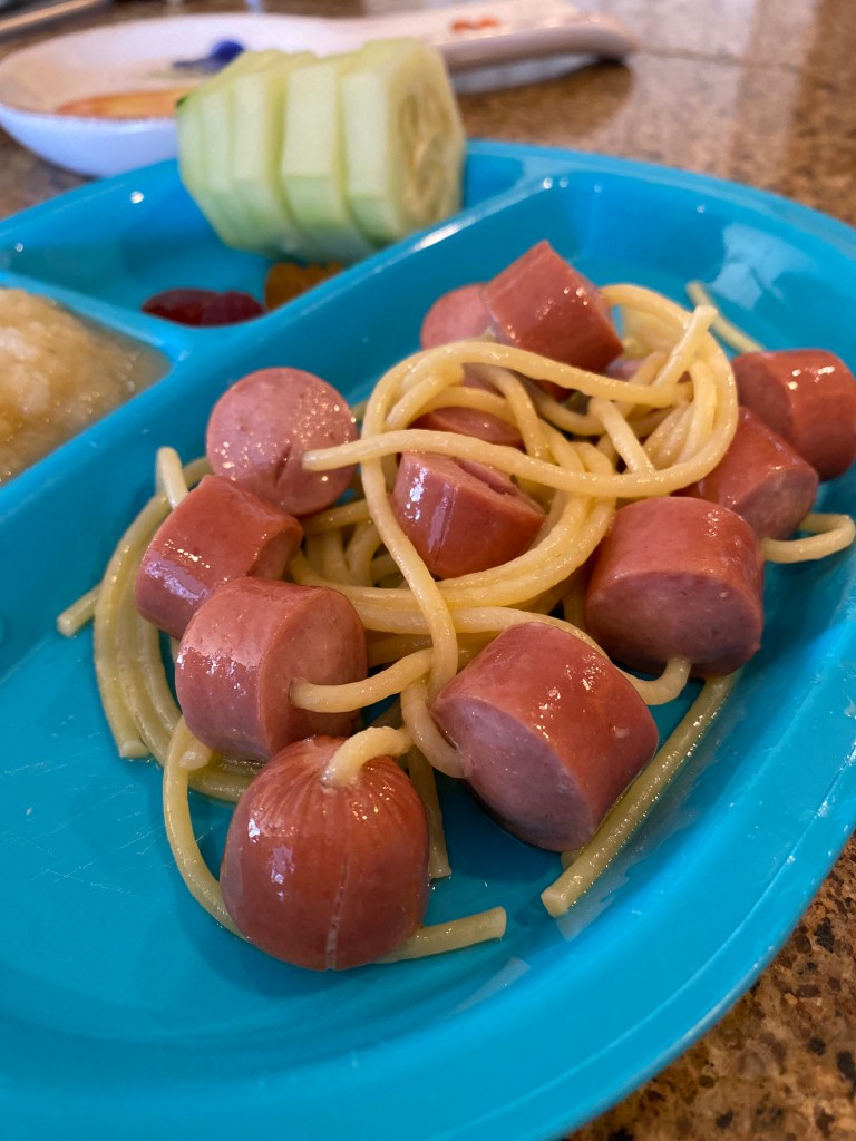 Yes, that is my daughter Jessica shielding her eyes as I impaled hot dog chunks on dry spaghetti and here’s what happened when I did: