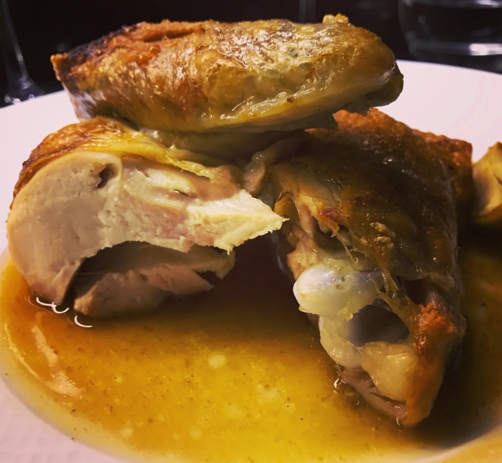 The chicken was beautifully roasted, with extra juices on the plate, and a crispy skin that gave way to a bite of beautifully brined-then-roasted bird…
