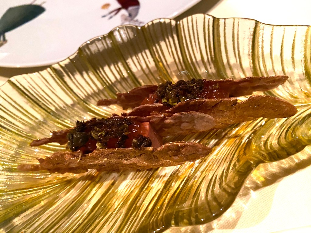 It begins this way…a variety of canapés starting with Crostini de Legato, with chicken liver mousse, caper and shallot…then “Farinata” with crispy chickpea – and lastly some lavender scented cantaloupe…