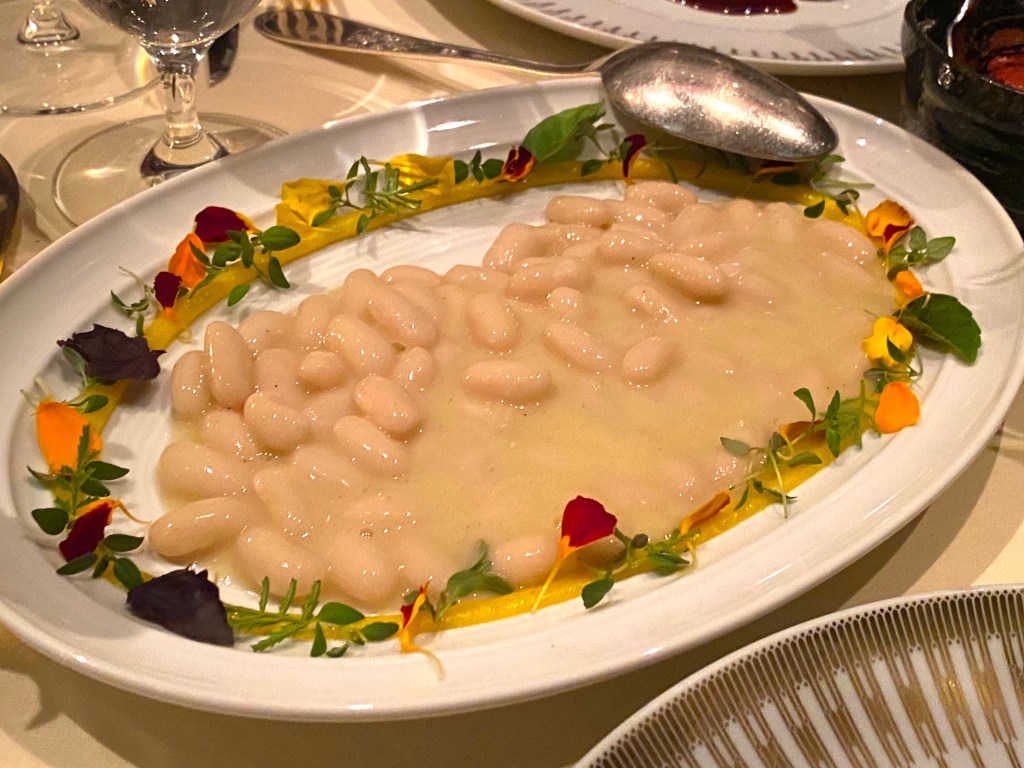 They finished by taking the “Fagioli” out of the hot fire and putting it on a late ringed with a lemon, thyme and rosemary sauce and fresh flowers….