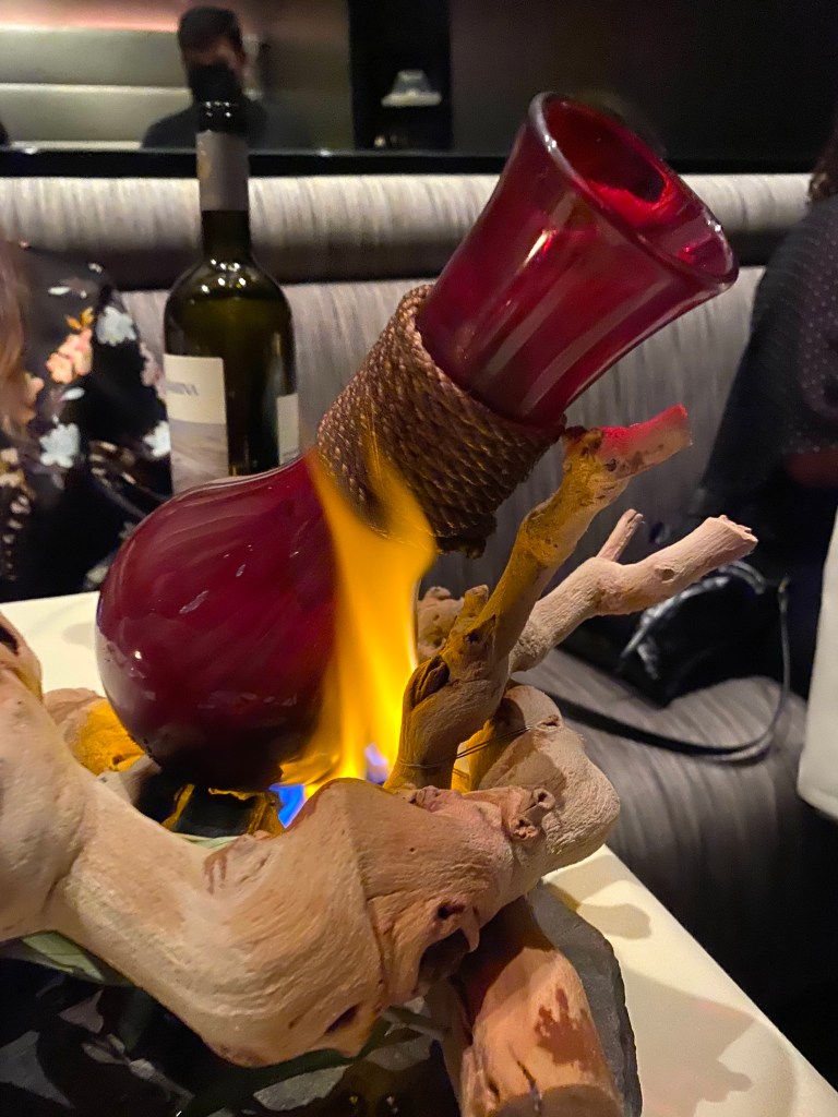 A Server set down a large platter and set it on fire!