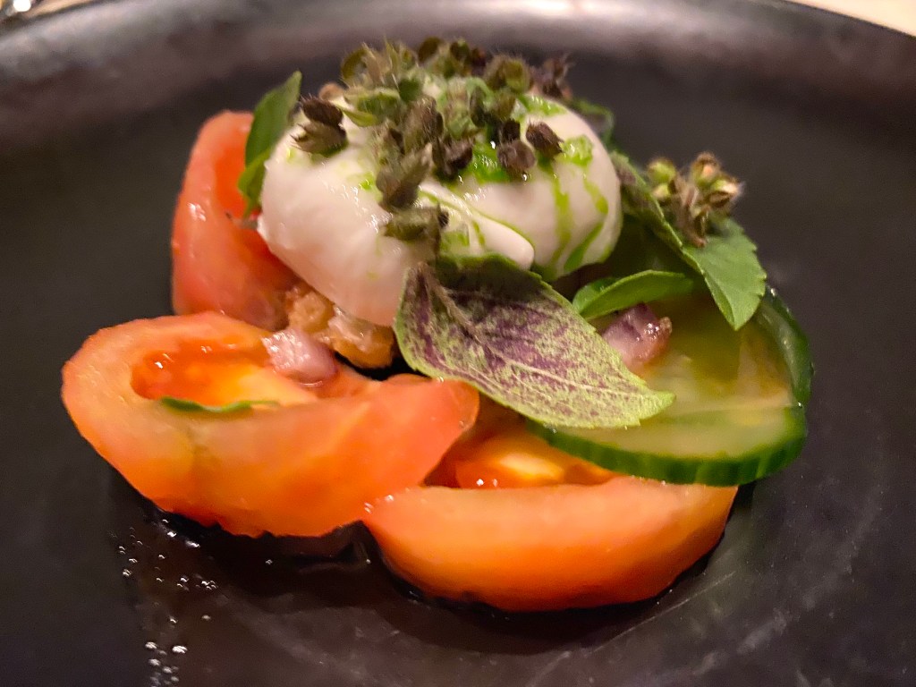 Next up, a Panzanela salad with Heirloom Tomato, cucumber and burrata:
