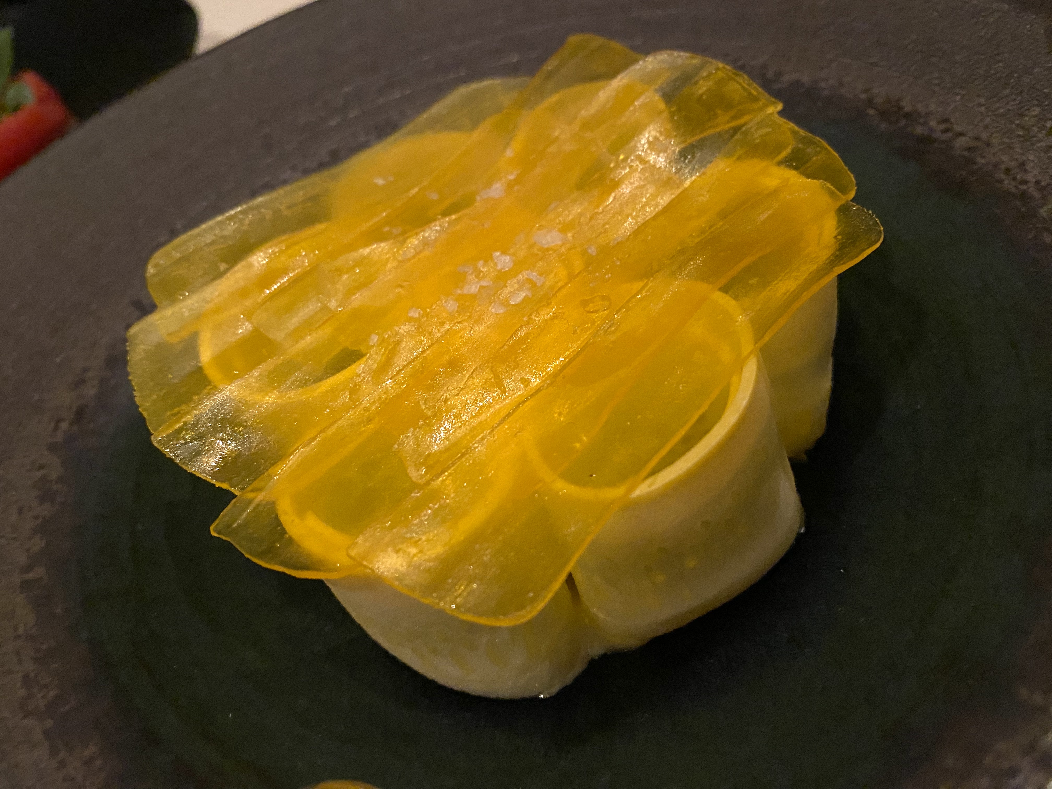 This a Ravioli, with mushroom ricotta, truffle and those are specially created sheets of parmigiana reggiano on top!
