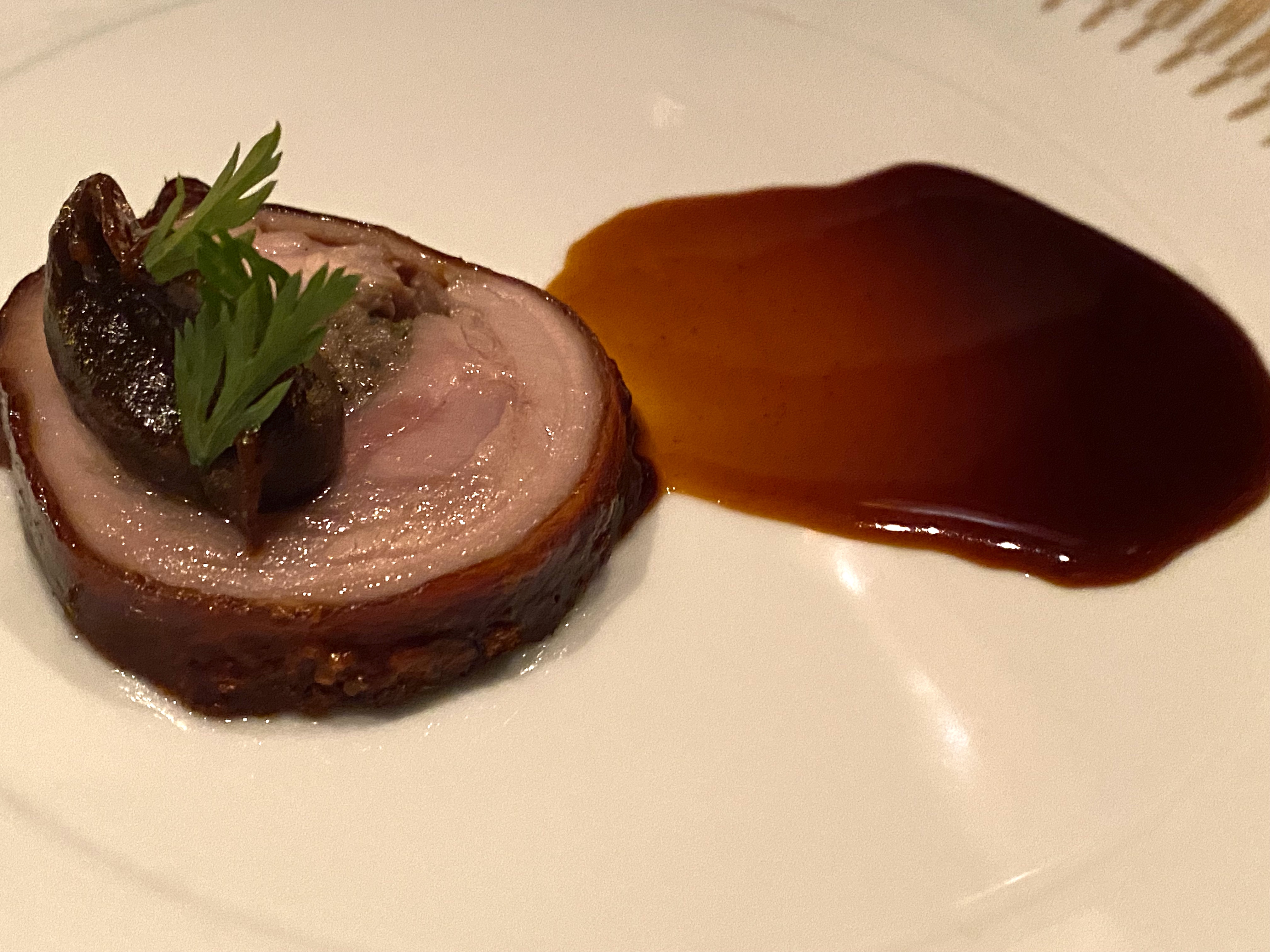You see, this was the accompaniment to our main meat course: a “Suckling Porchetta” with medjool date. pecorino Romano and oregano…