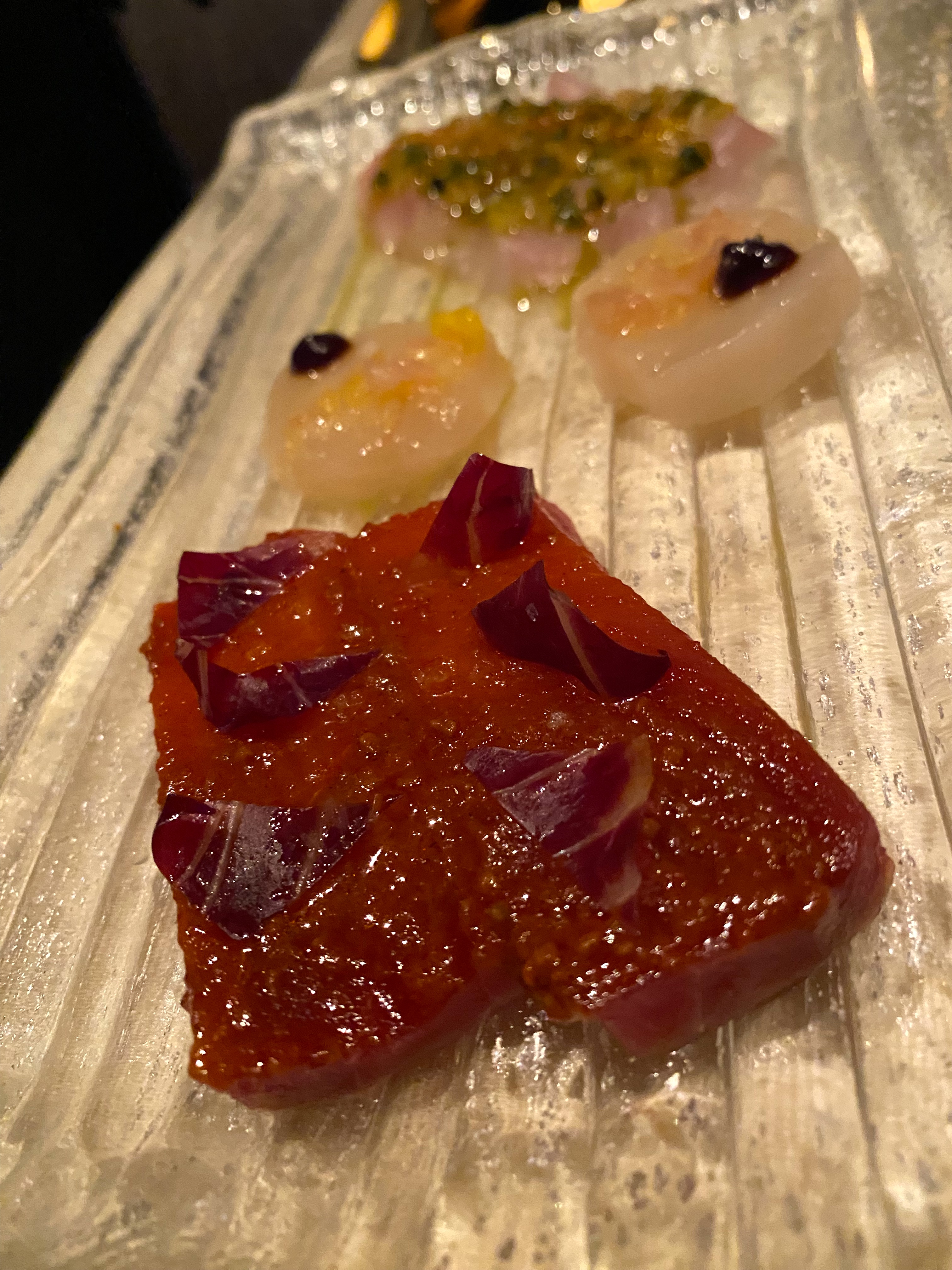 Then a trio of crudo: scallop, tuna and medai, a unique species of fish….