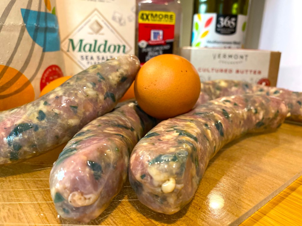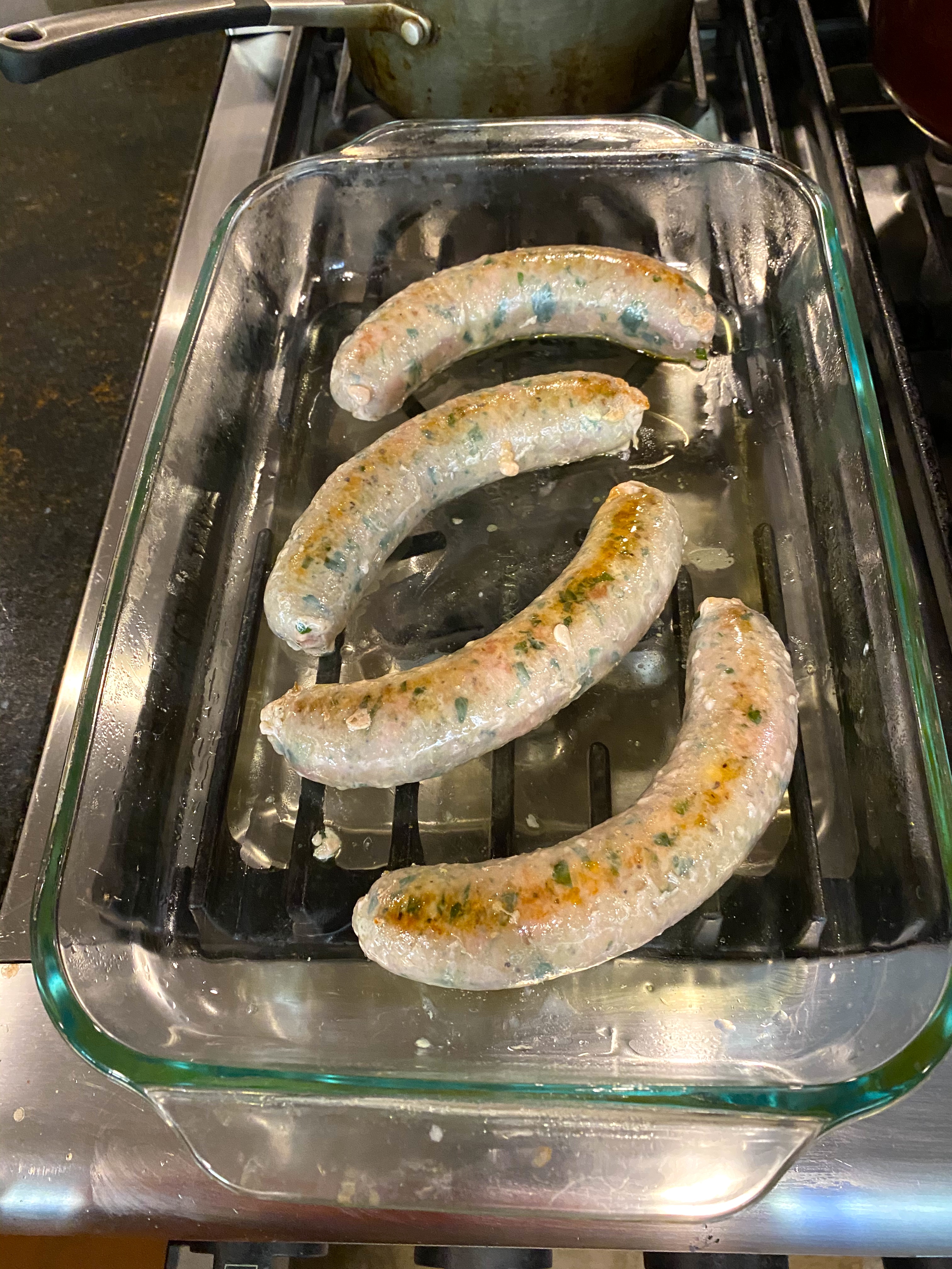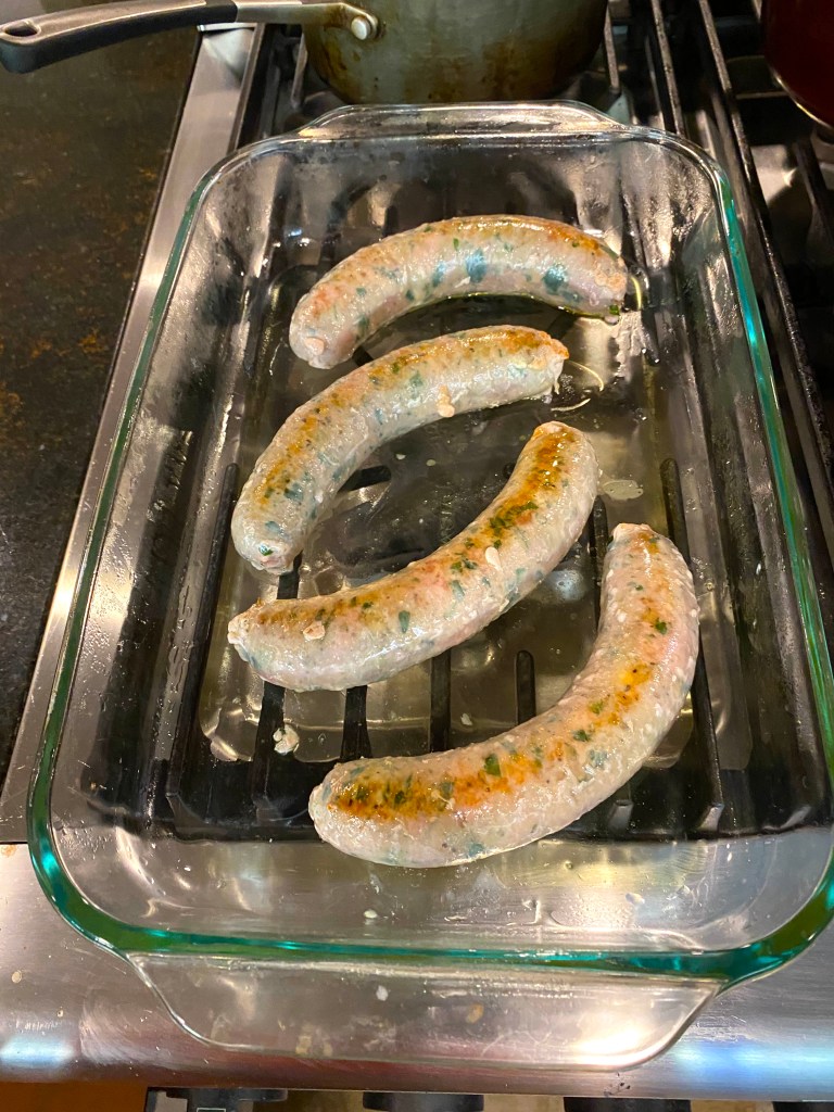 I got these fresh chicken spinach sausages from Whole Foods, taking a break from traditional pork sausages, which I also love…