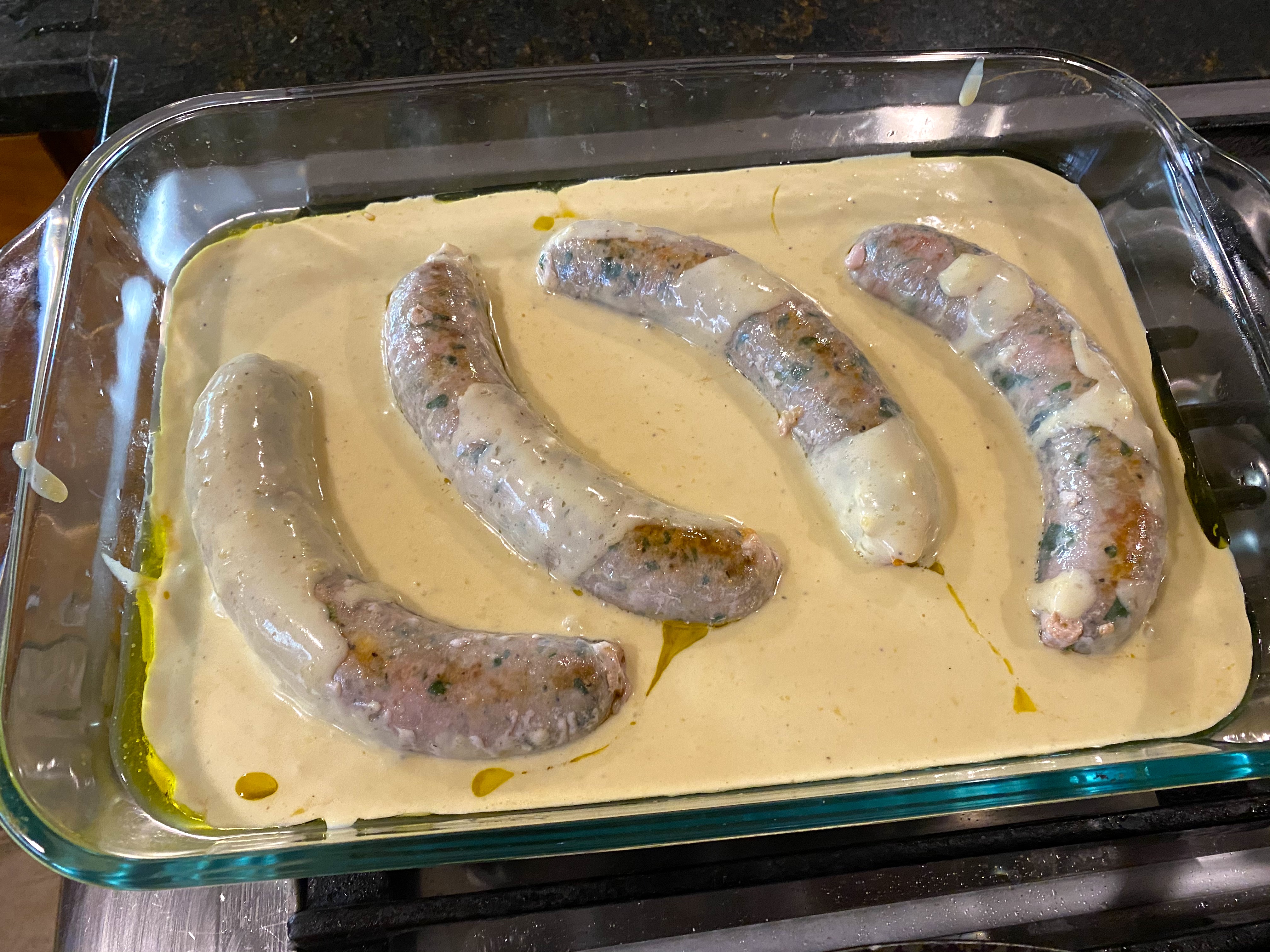 When the sausages have browned, and the dish in the oven is hot, pull the oven rack out a bit, put the sausages in the casserole dish, and gently pour the batter over the sausages like this: