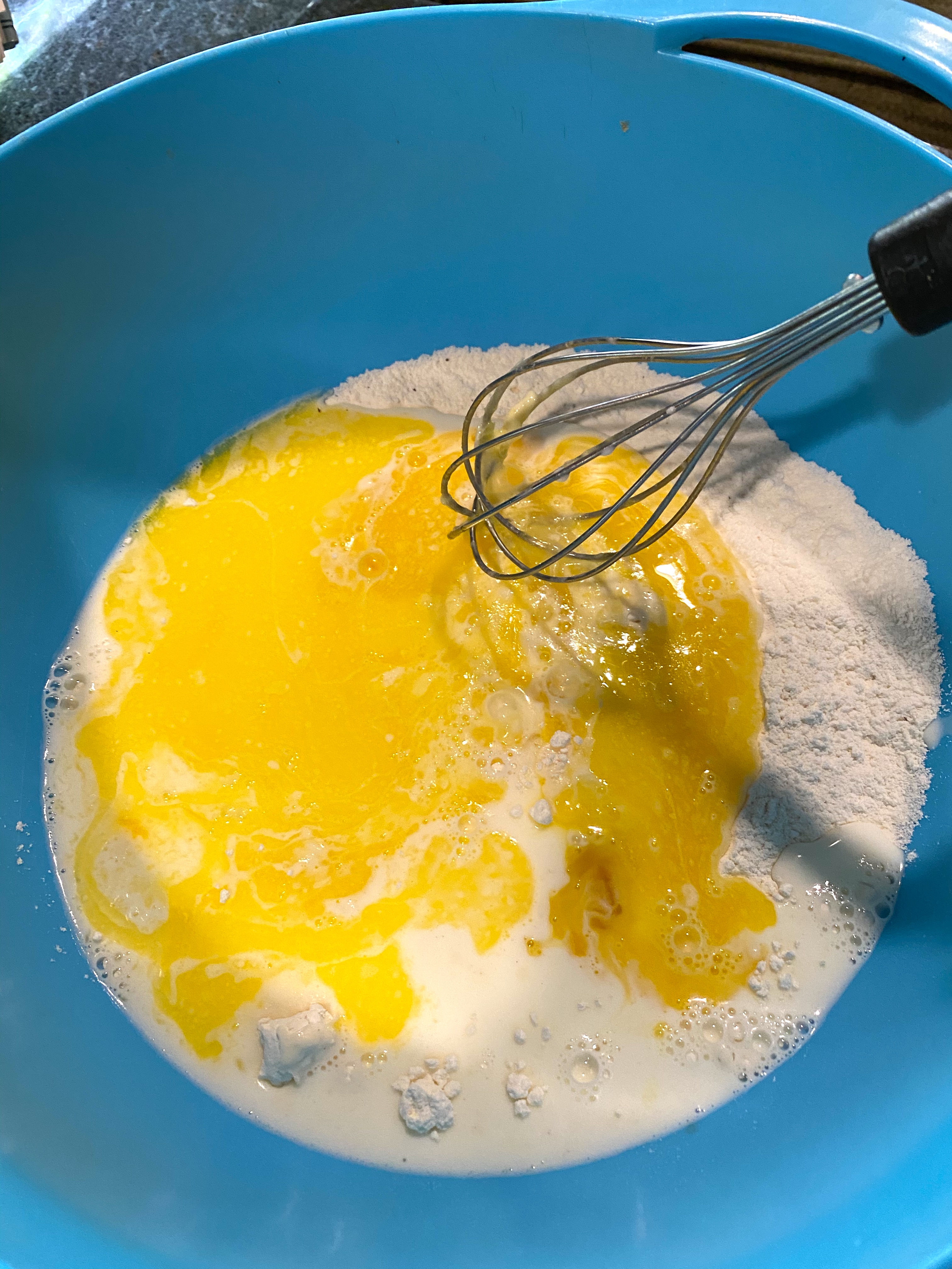 In a large bowl, whisk together the flour with the salt and a pinch of pepper. Make a well in the center of the flour. Pour in the eggs, milk, and melted butter into the well and whisk into the flour until smooth.