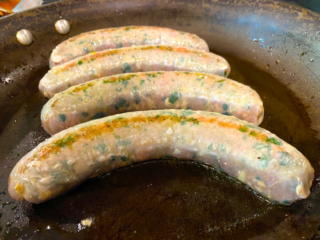 Heat a tablespoon of vegetable oil in a skillet on medium high. Add the sausages and brown them on at least a couple of sides.