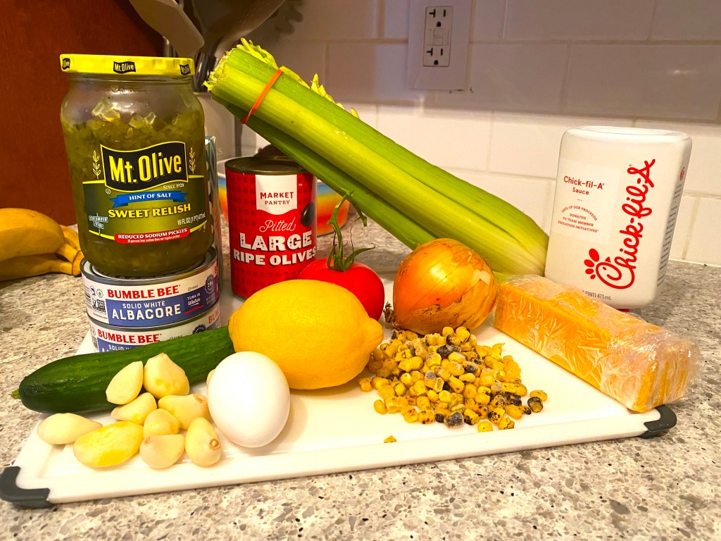 For crunchy contrast, the chopped onion and celery work nicely… then, I added some Chik-fil-A” sauce and mixed it in!