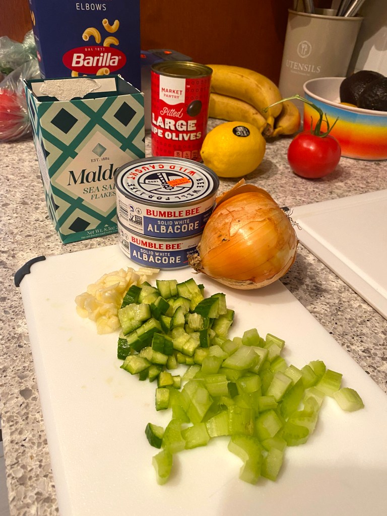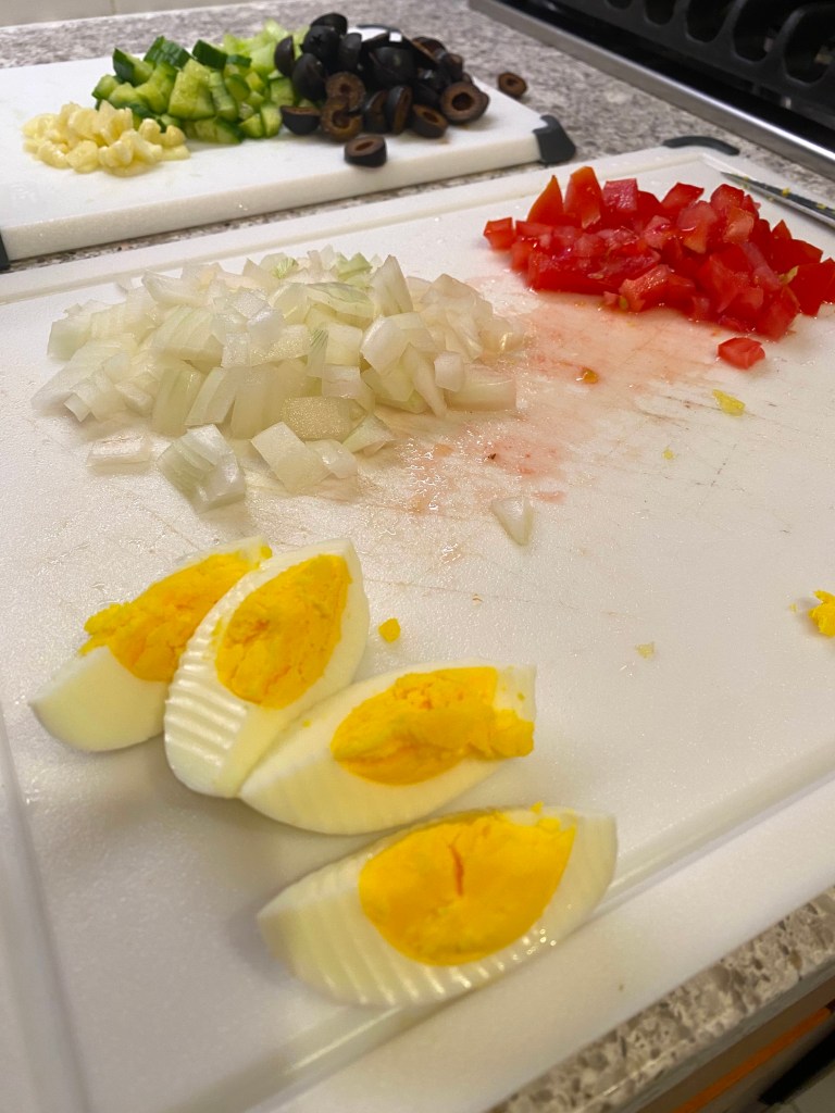 After prepping all of the ingredients, I boiled two cups of macaroni noodles and hard-boiled two eggs and let them cool. That’s really all the cooking there is!