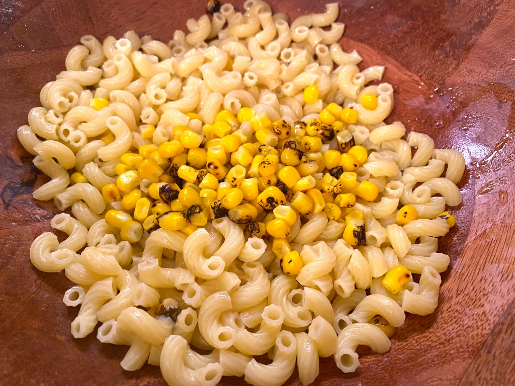 I thawed some roasted corn and added it to the cooked macaroni noodles…then all of the other ingredients into a bowl.