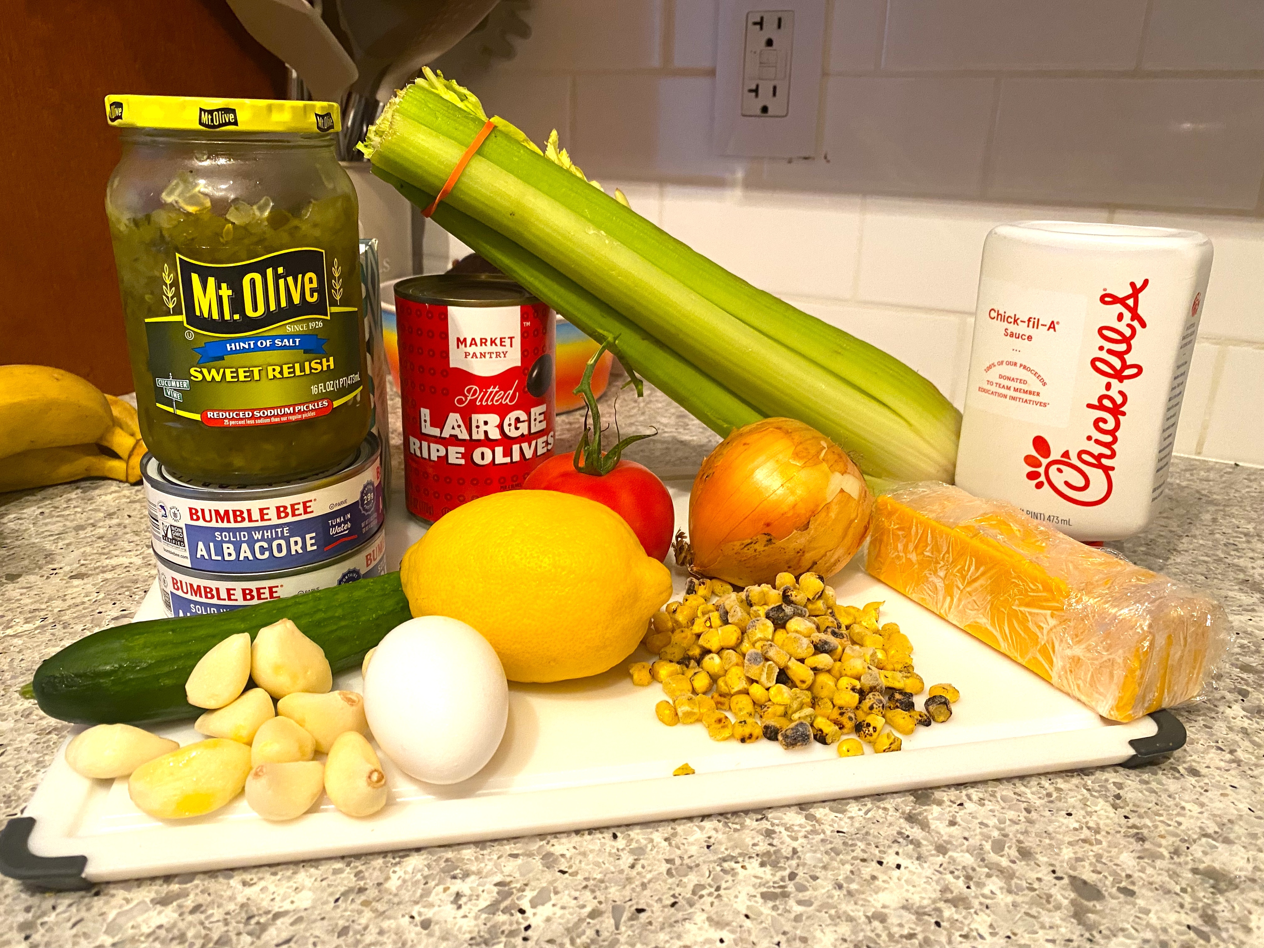 For crunchy contrast, the chopped onion and celery work nicely… then, I added some Chik-fil-A” sauce and mixed it in!
