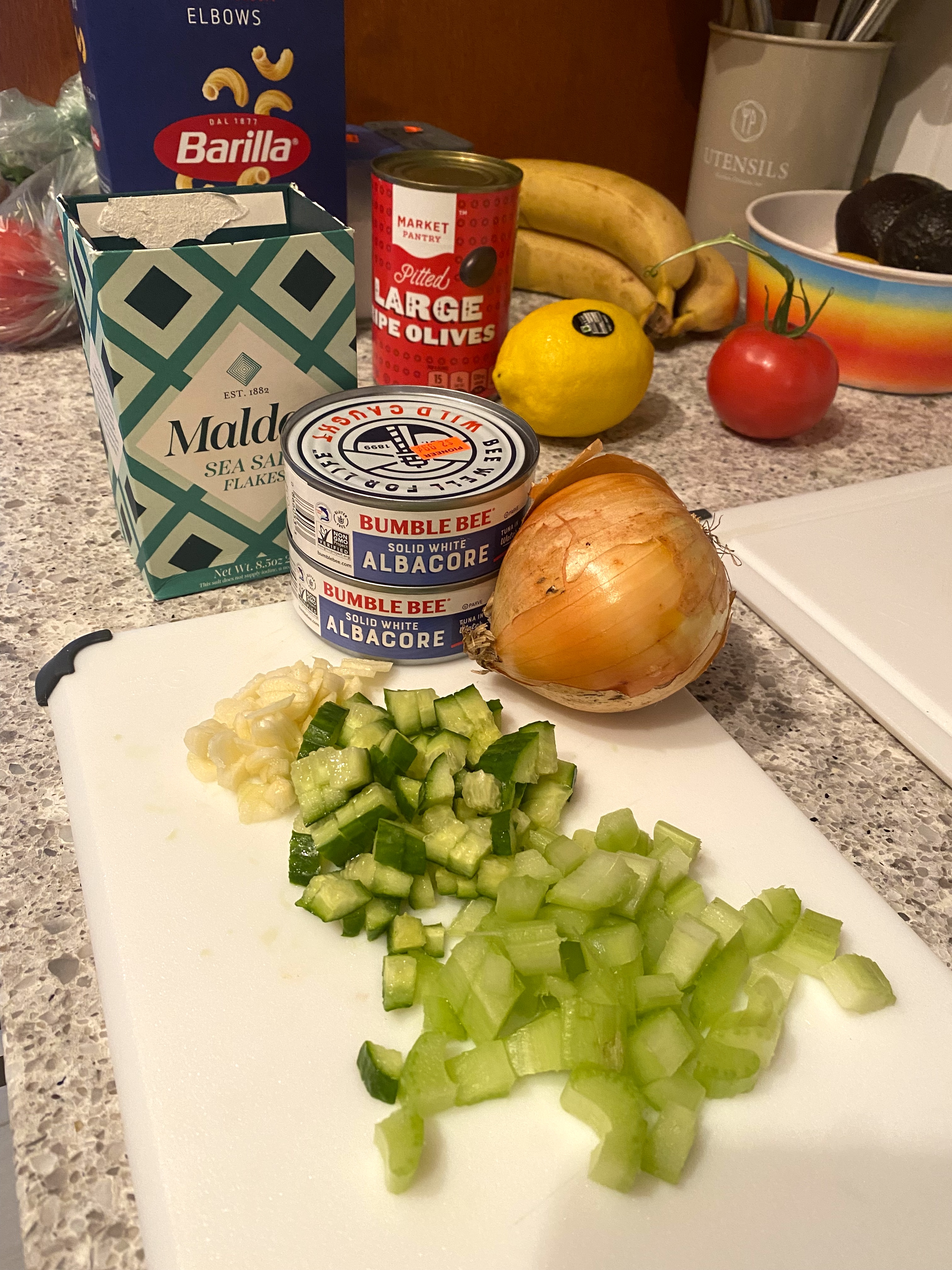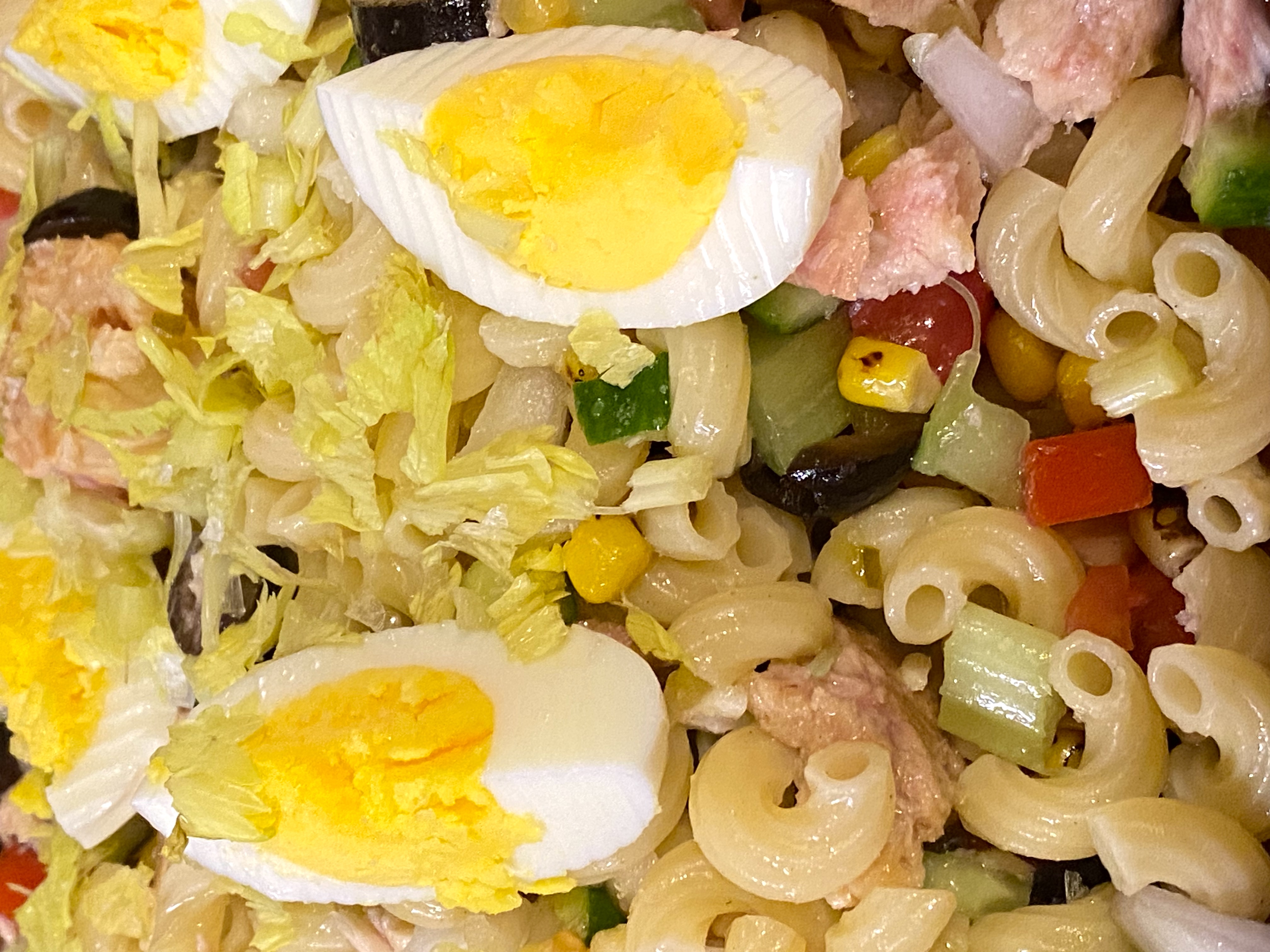 After prepping all of the ingredients, I boiled two cups of macaroni noodles and hard-boiled two eggs and let them cool. That’s really all the cooking there is!