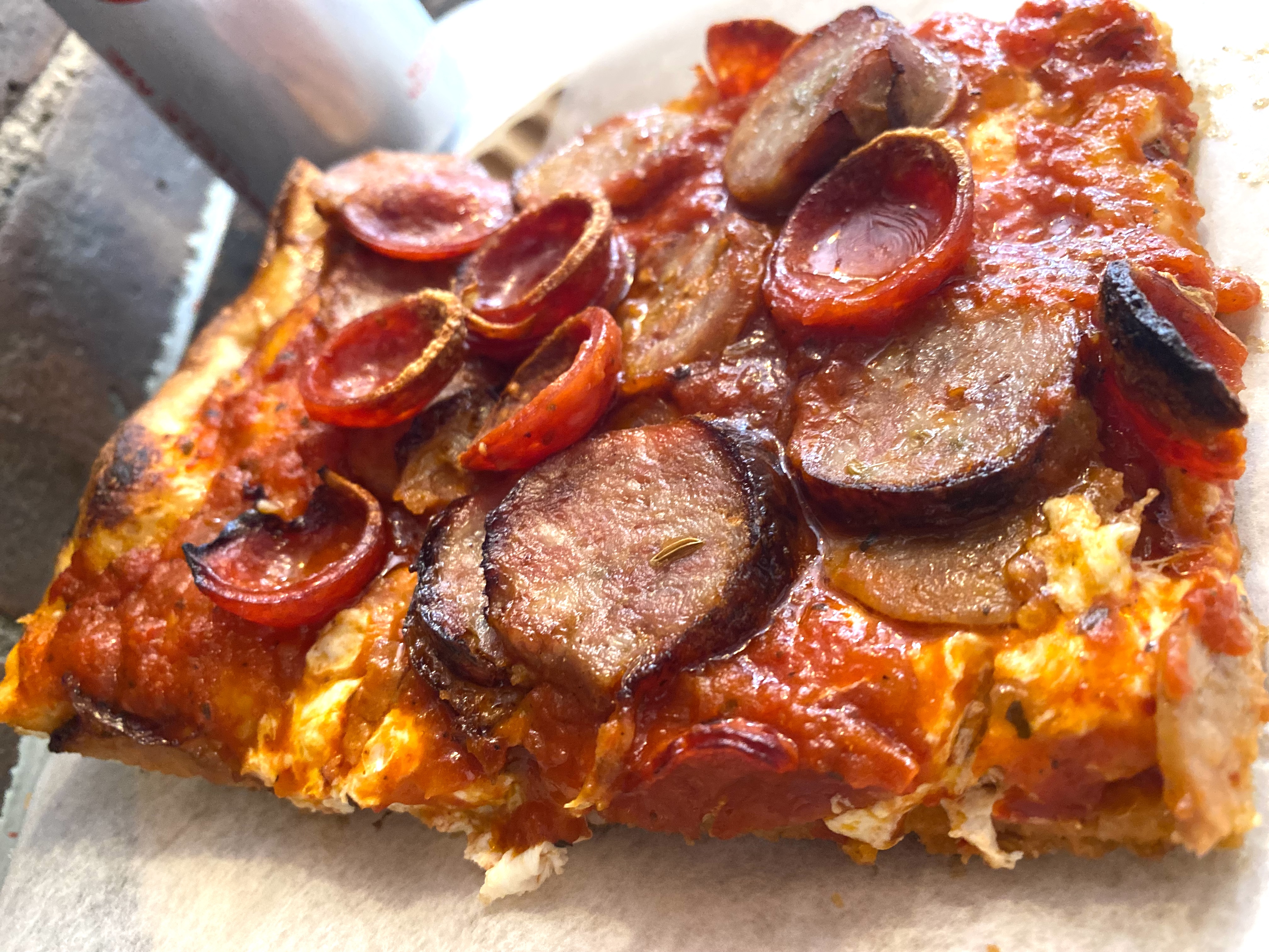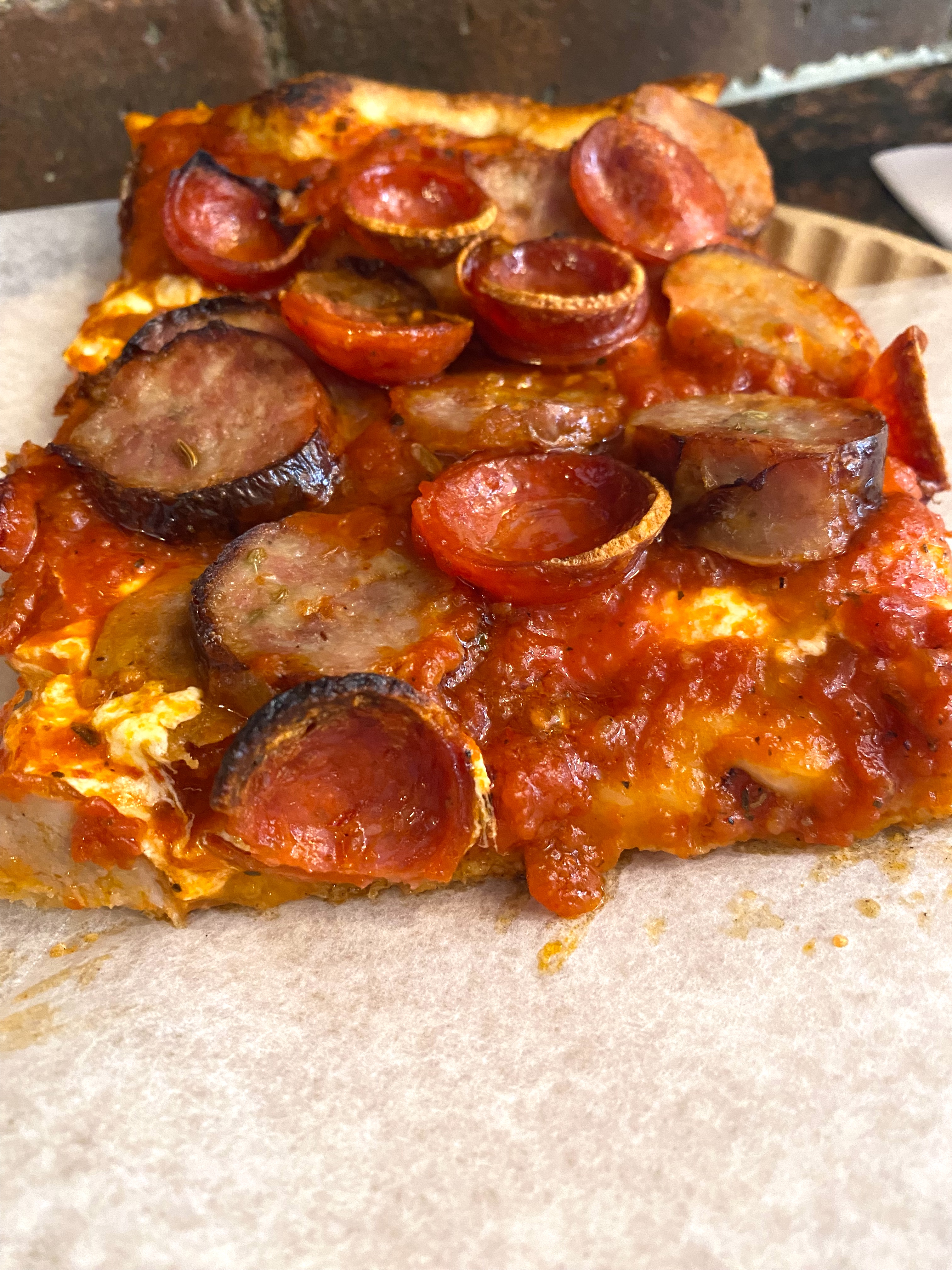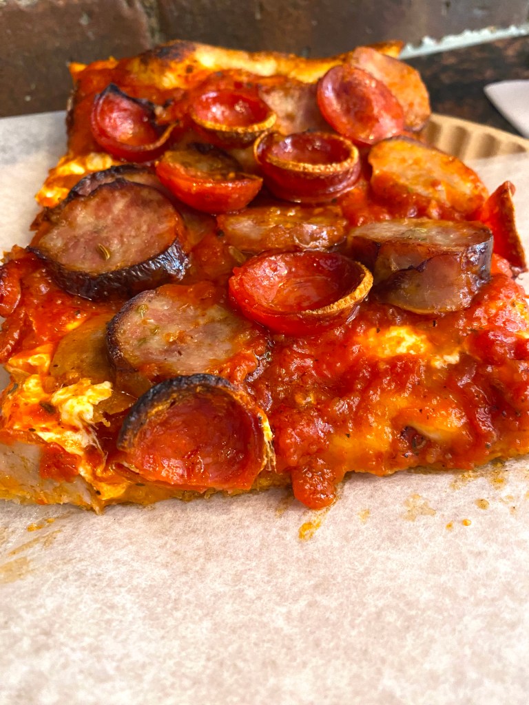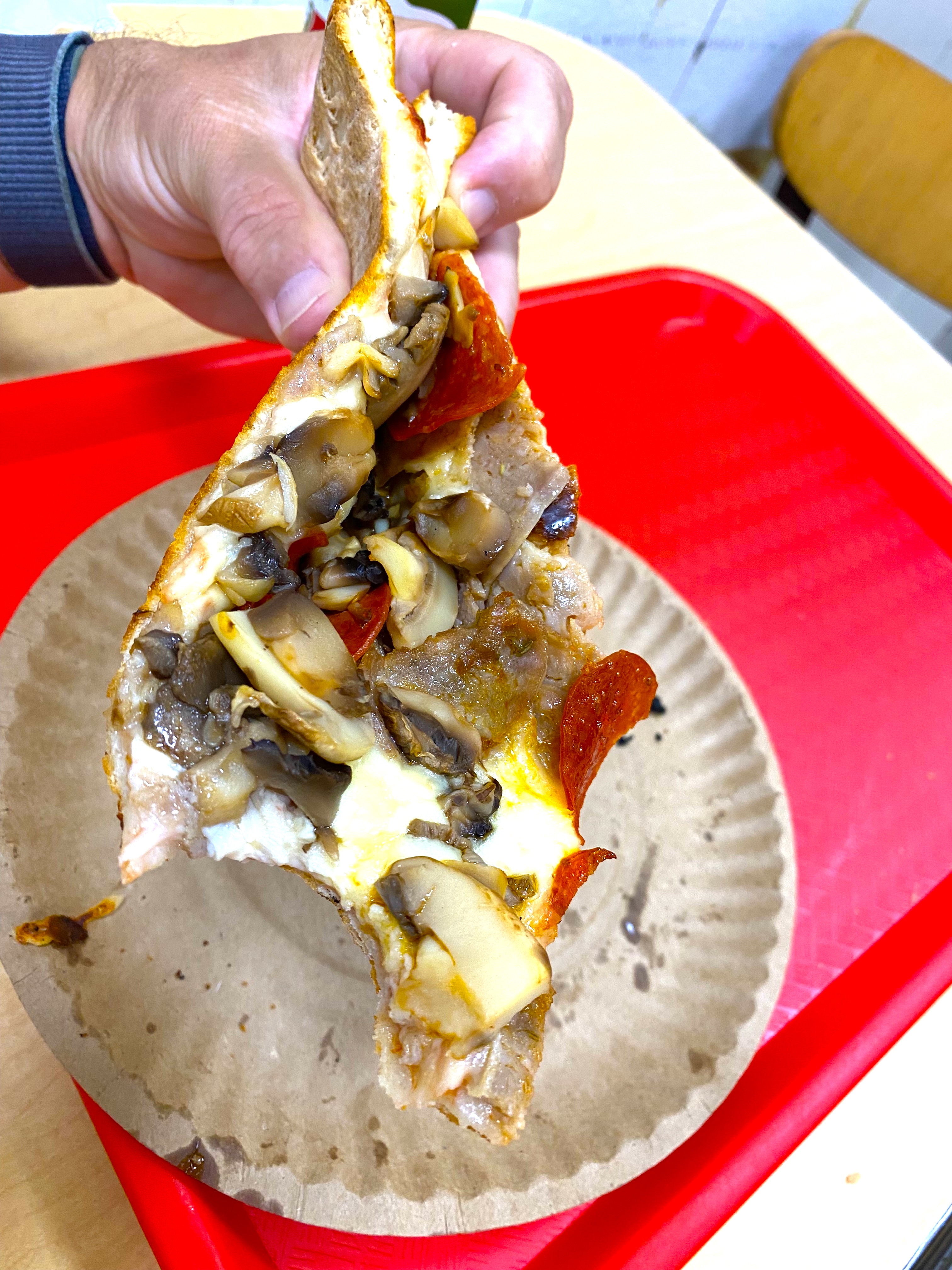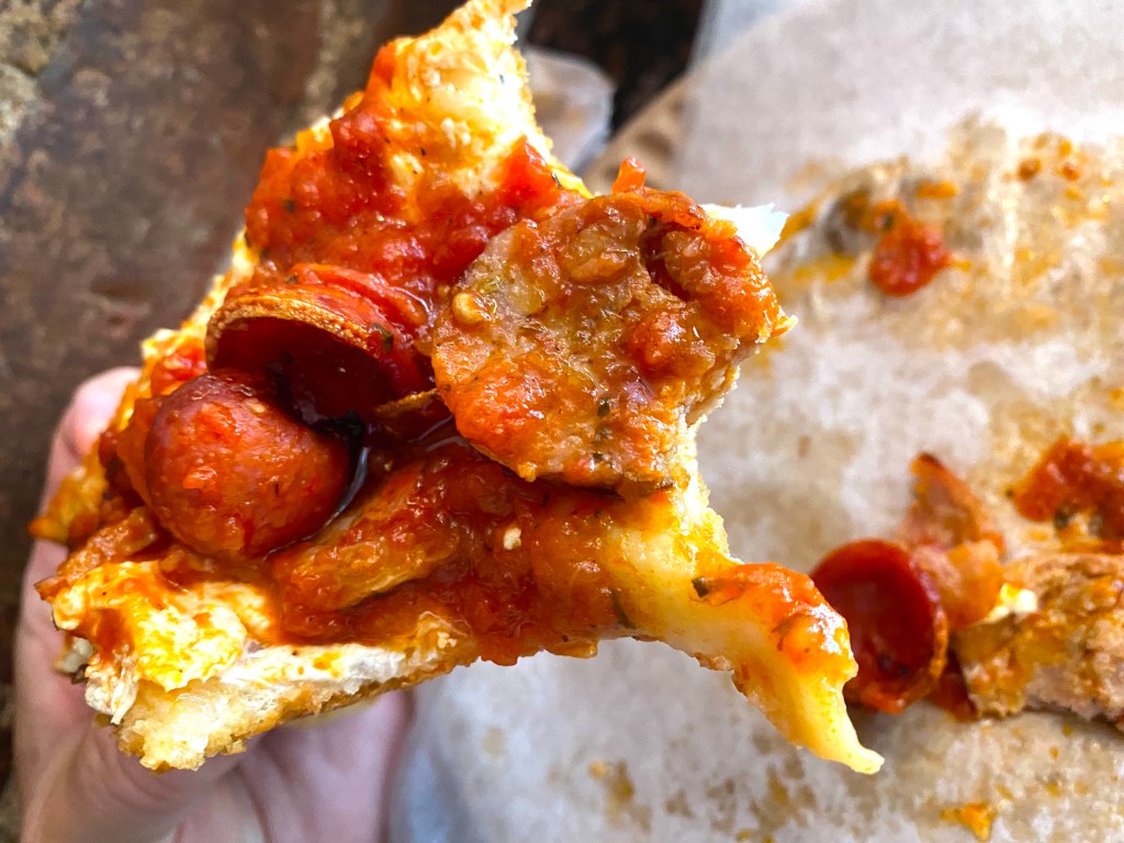 I you watched the clip you’ll see me eat this slice of pizza with sausage, pepperoni and mushroom – I folded the crust to get a handle on it and had a big bite: