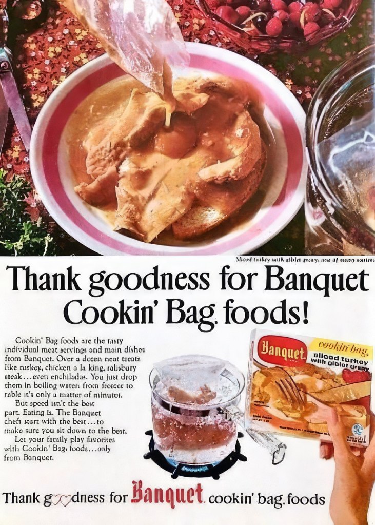 It was a simpler time, right? I mean, these retro ads for “cookin’ bag” foods are something!