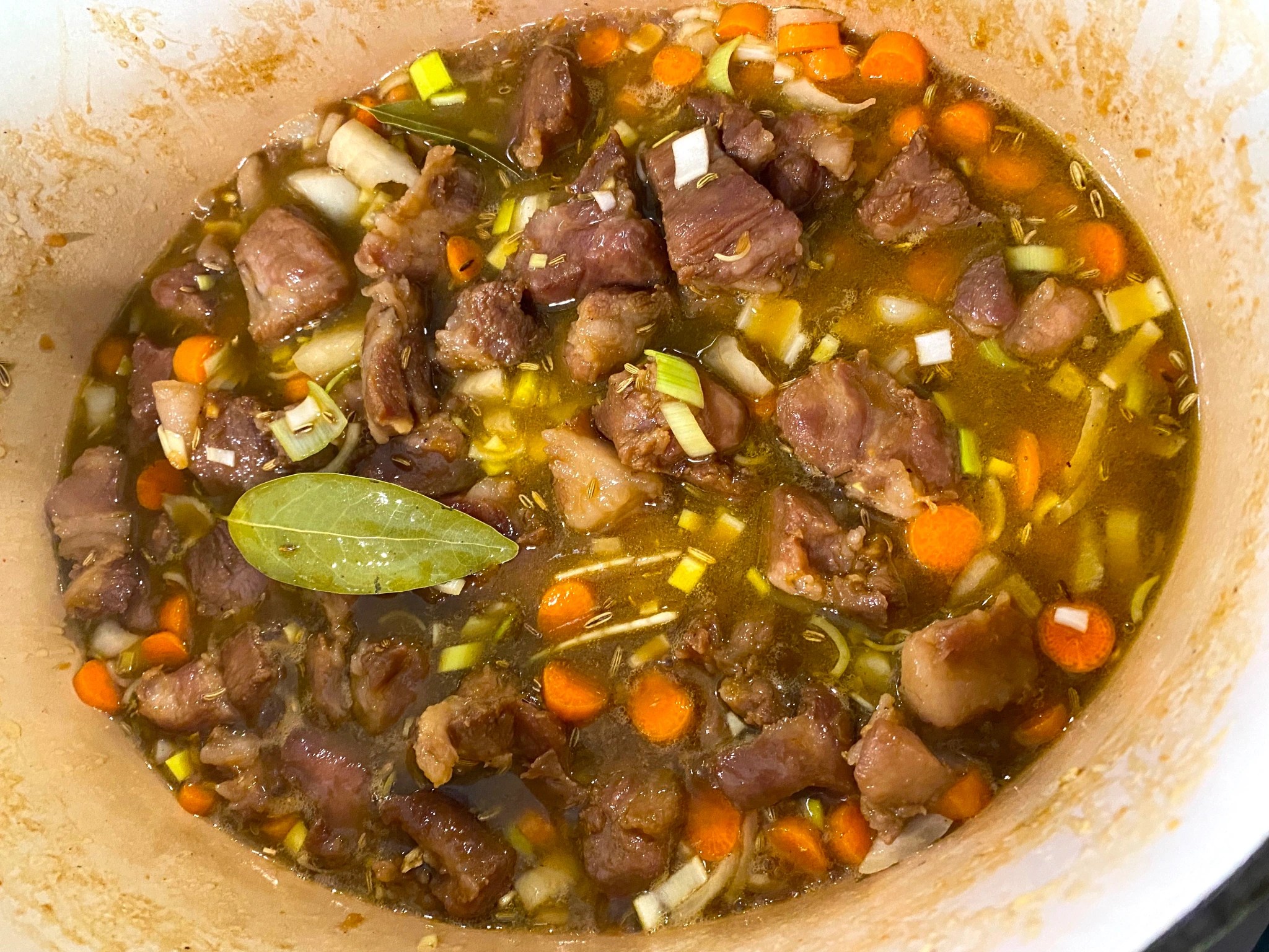 Here’s what the dish looks like after adding the wine, sliding in the carrot, leek and onion, plus 3 bay leaves and some fennel seeds as well.