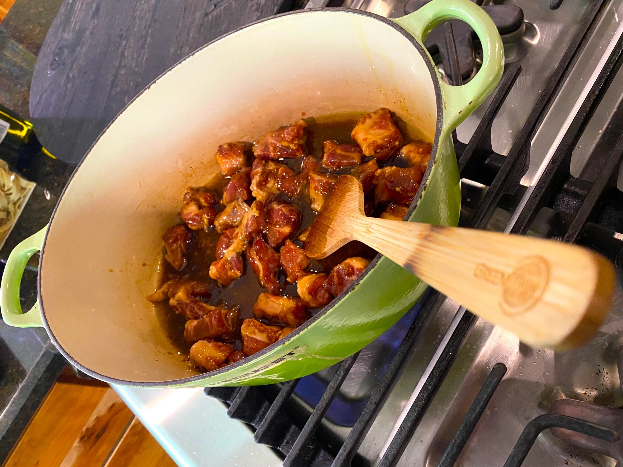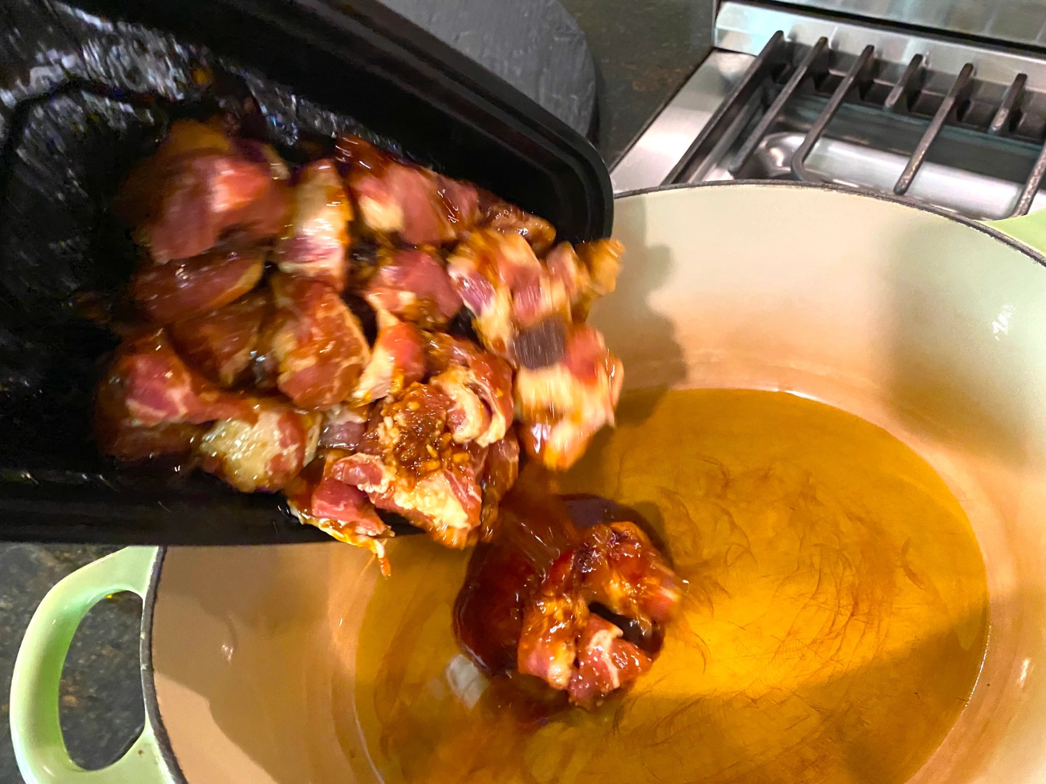 After marinading for an hour, I pulled the pork out and began to sear it in a large pot – turning them with tongs and liberally seasoning with salt and pepper as I go.