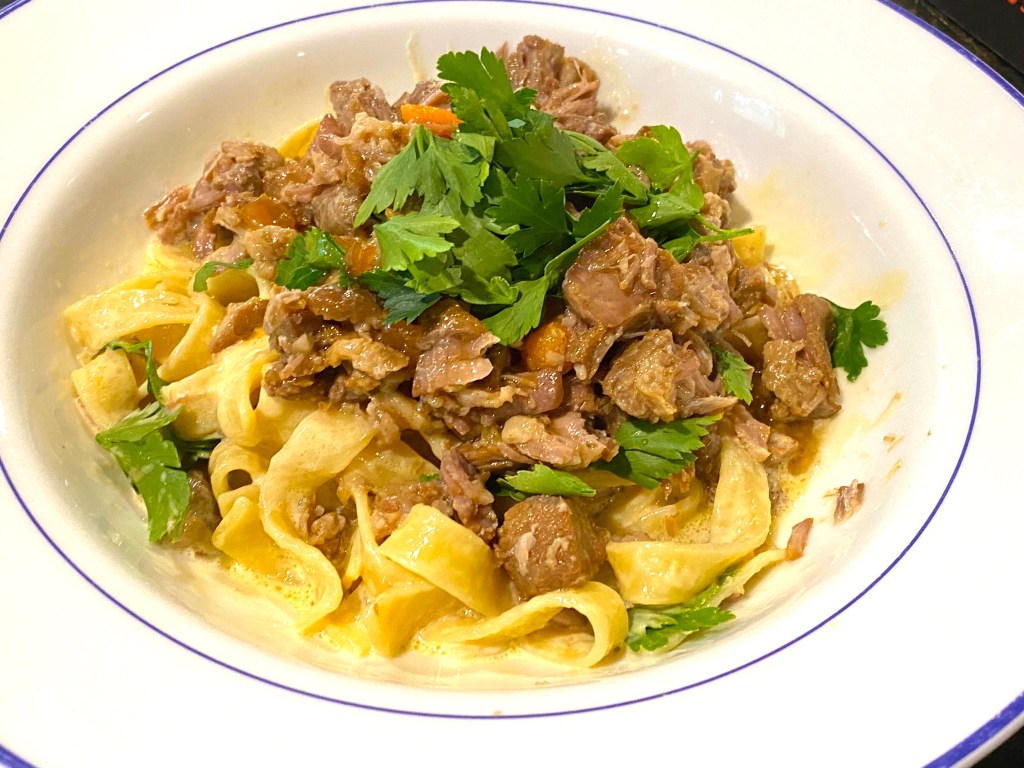 Here Is Sara’s “Pulled-Pork Pasta With Almond Cream Sauce!”