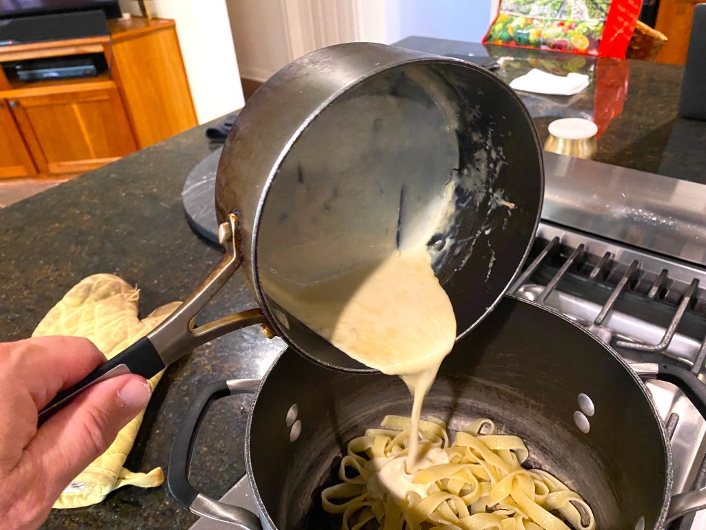 The last step is to add the almond cream sauce to the noodles and mix it together – and all that is left now is to bring the ingredients together: