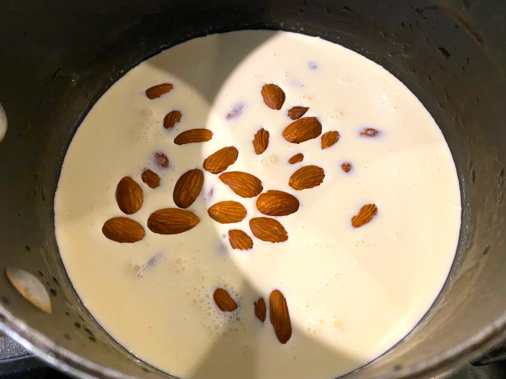 Combine a quart of heavy cream with 2 cups of lightly toasted whole almonds and slowly simmer for 30 minutes…strain out the almonds and simmer until the cream coasts the back of a spoon….here is where I added a teaspoon of Vanilla extract…