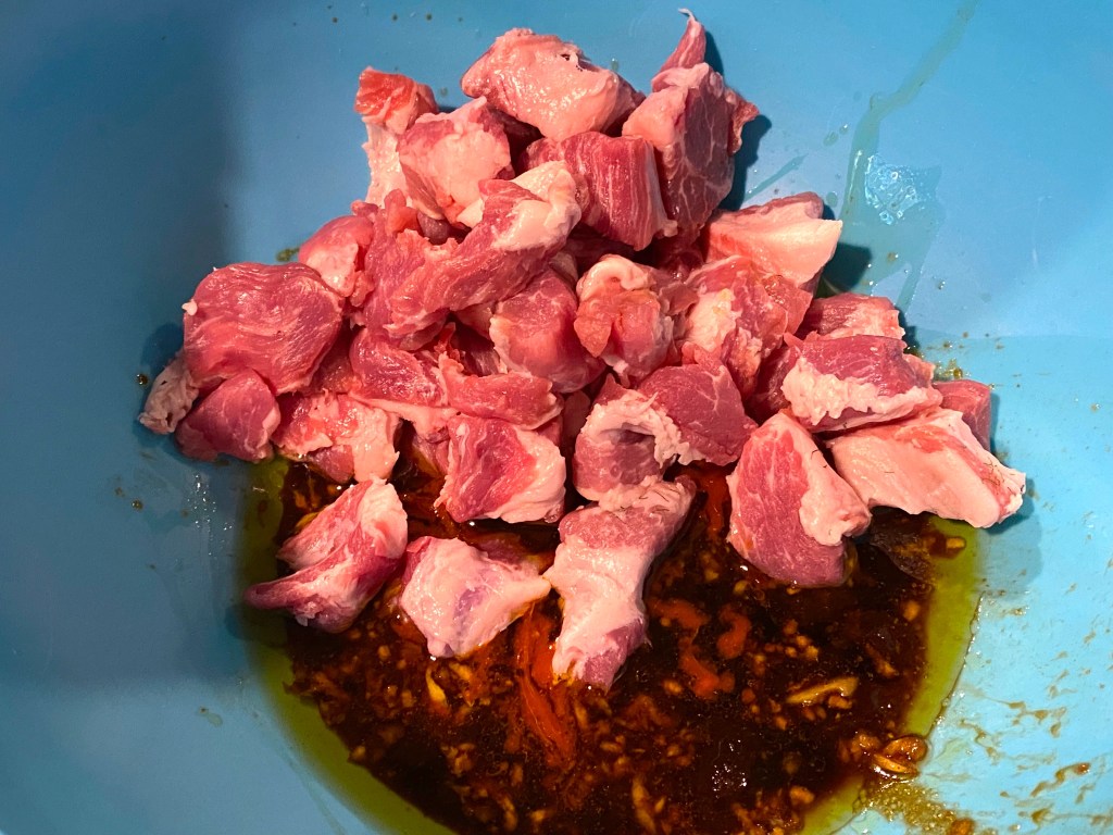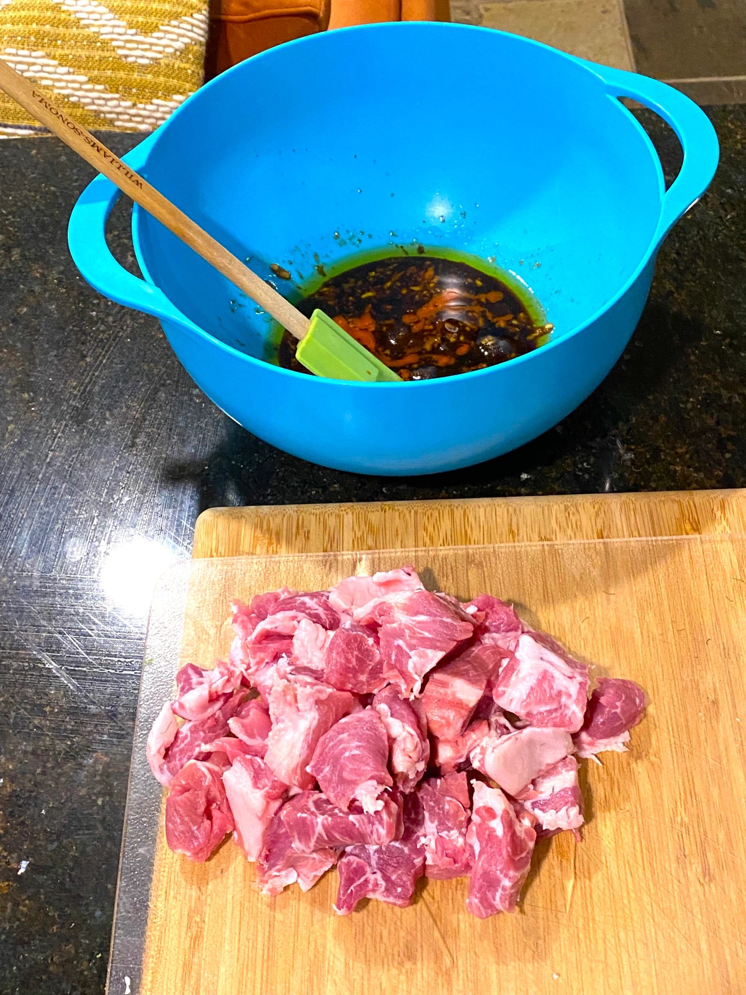 First up, take the pound of pork butt and cut it into large cubes, to get it all ready for the delicious marinade:
