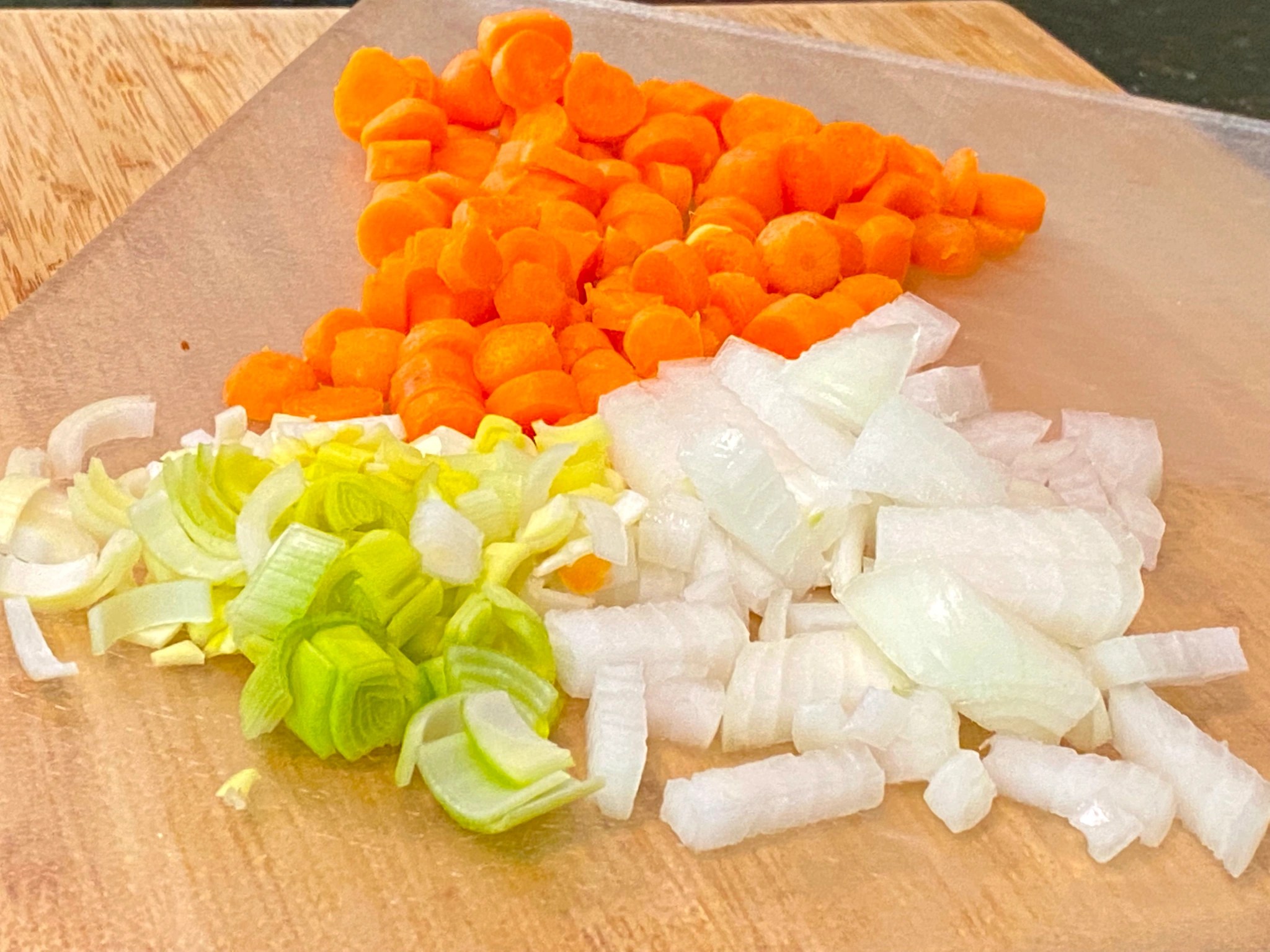Now that the pork is marinating, the leeks, onion and carrot now need to be diced – a large carrot, leek and onion ready to cook.