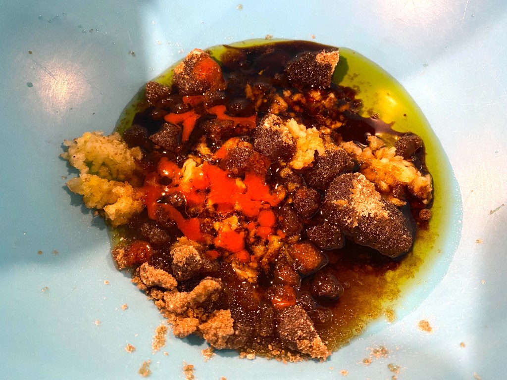 As the recipe says, we will first make our pork marinade using crushed garlic cloves, 3 tbl. brown sugar, the same amount of soy sauce and hot sauce….I always tweak these amounts based on my own flavor preferences…