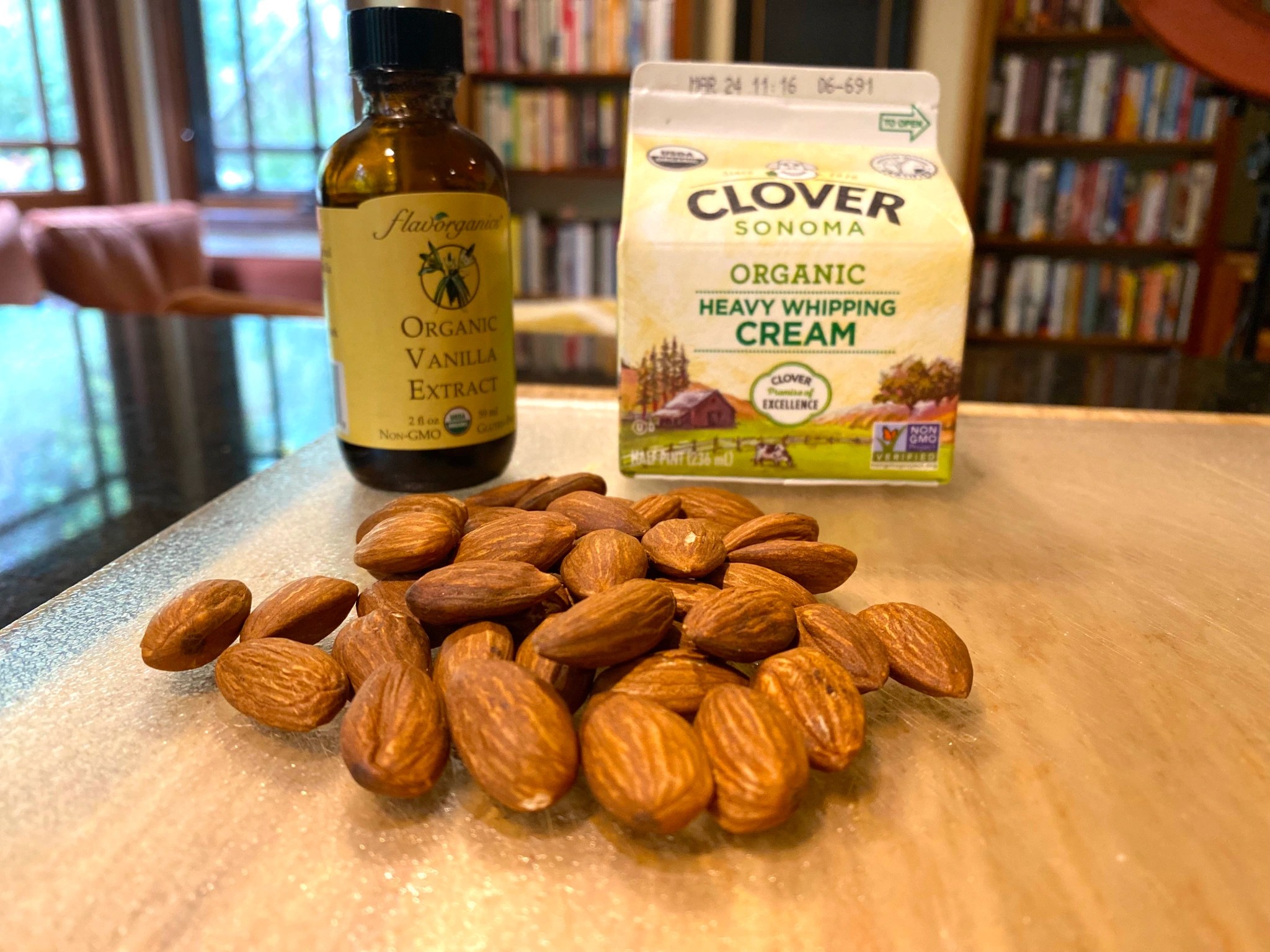 You need heavy cream, toasted almonds and almond extract – well, I had Vanilla at the ready and love that flavor…
