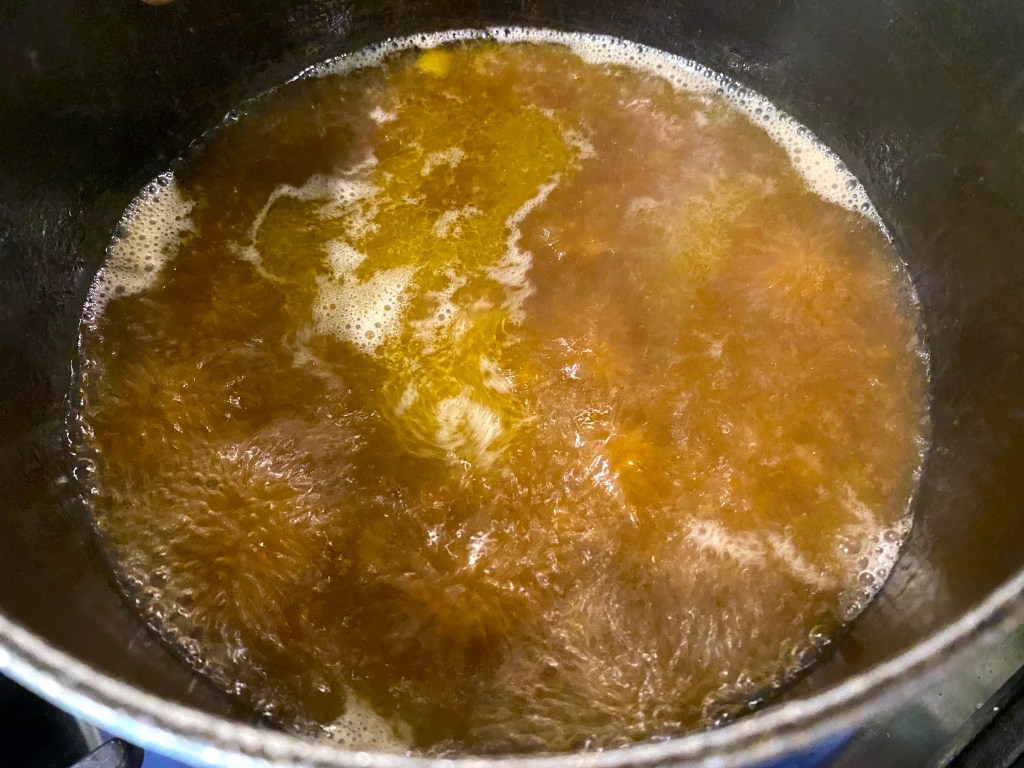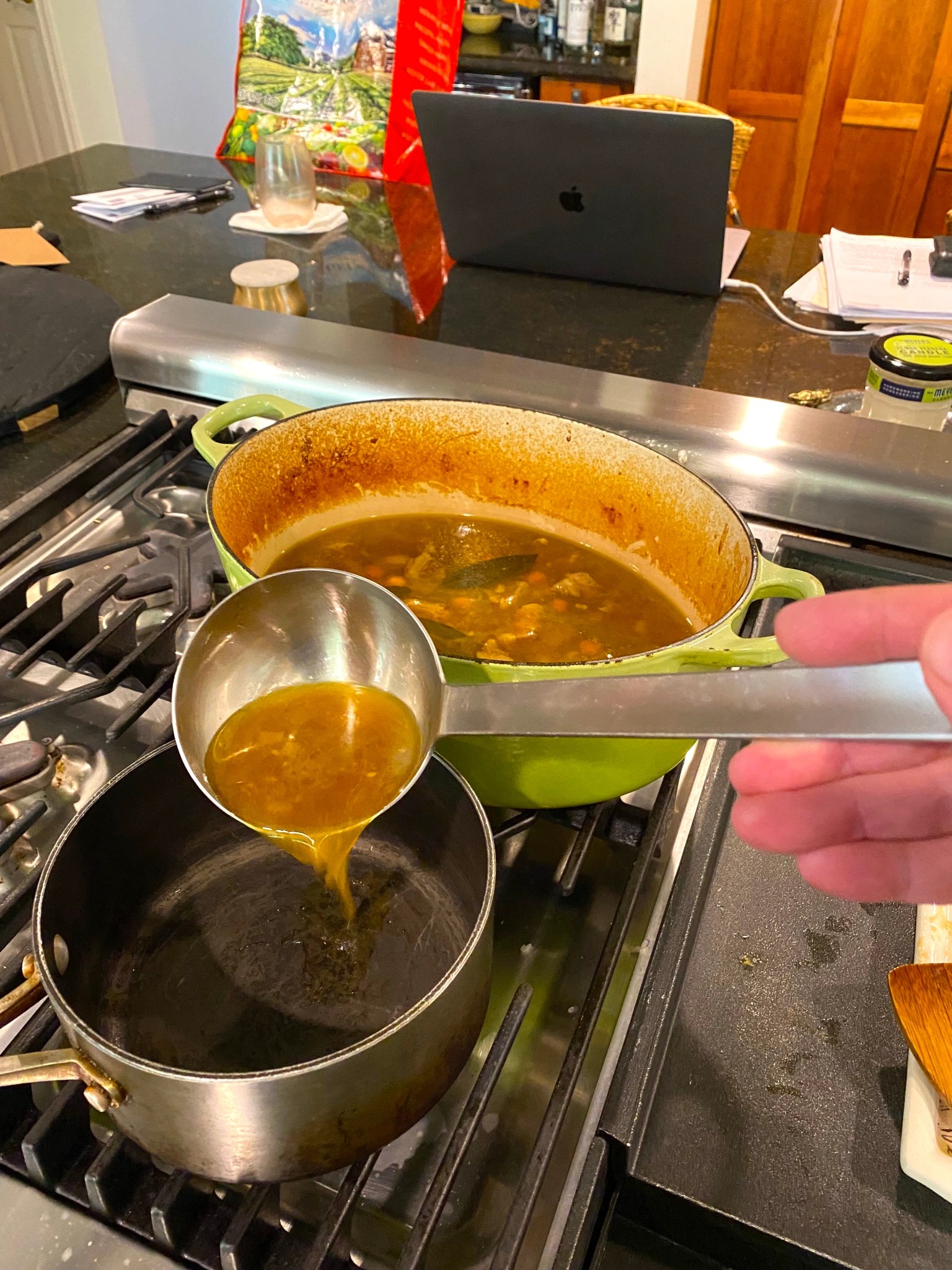 Reduce the stock in half – folks this is a delicious sauce that we’ll use later! You can discard the remaining aromatic vegetables in the pot….