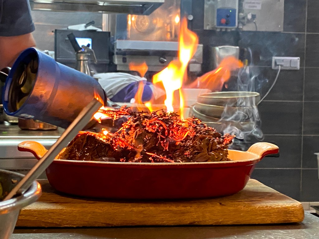 Chef also makes a “flaming lamb” dish with fresh herbs roasted on top – while he hold onto the pan!
