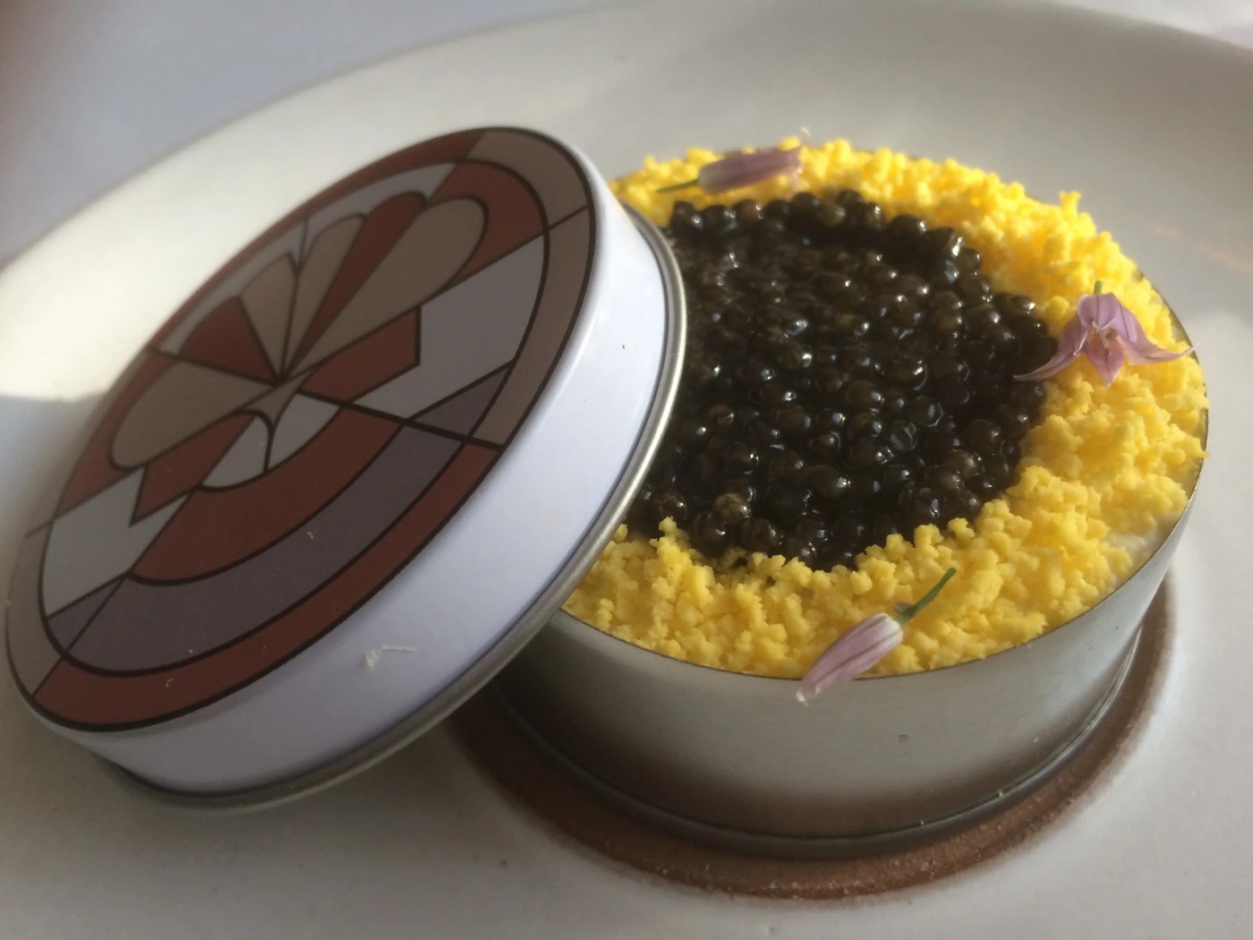The restaurant has a unique way of sharing the menu: it is given to you after the meal in a cool round tin – with the menu printed on a circular paper inside like this!