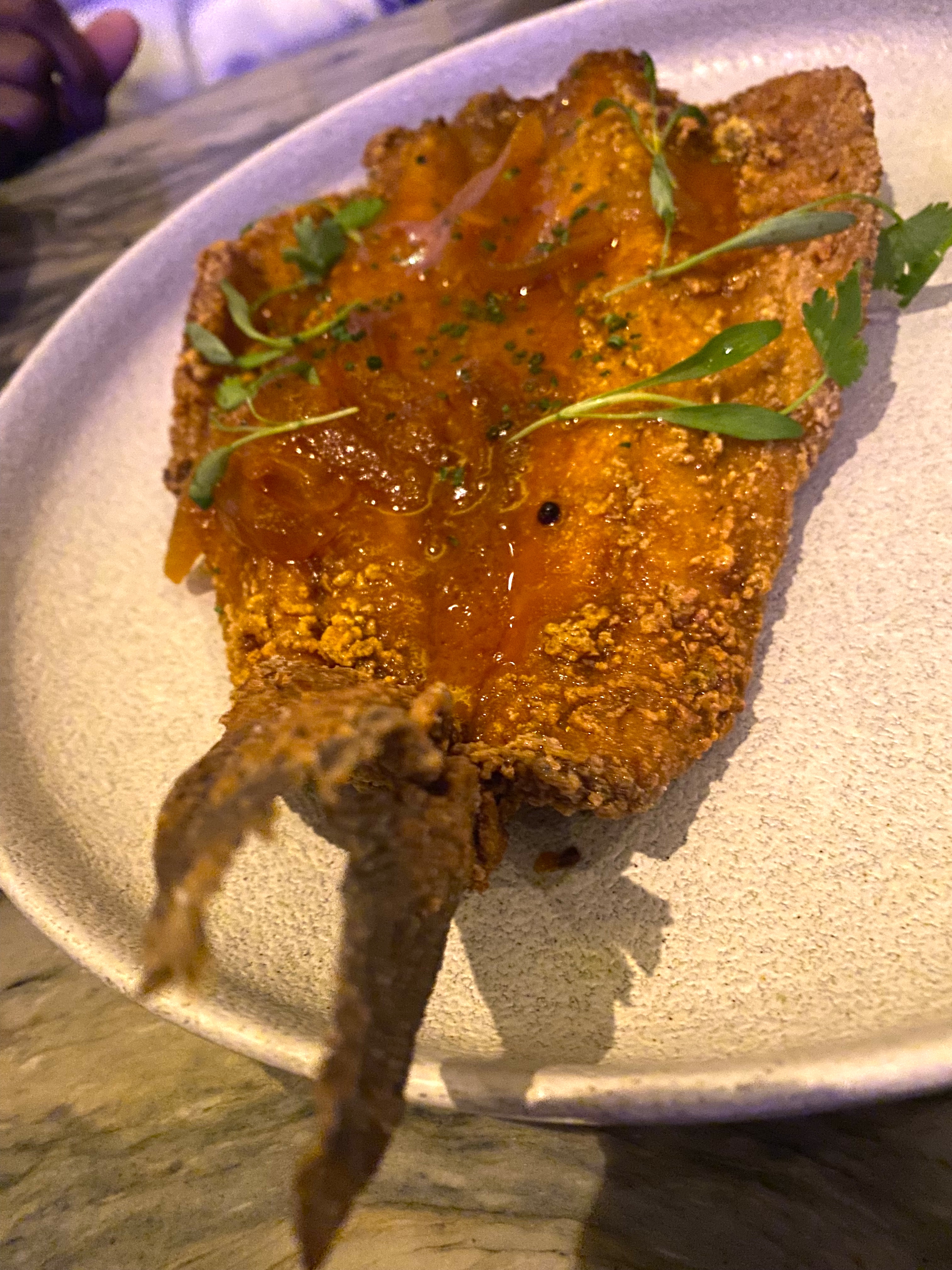 I love fried fish, and this Branzino was coated with a breading that had some very unique spices, along with a bit of brown sauce that was also uniquely spiced..of course, I decided to use my hands: