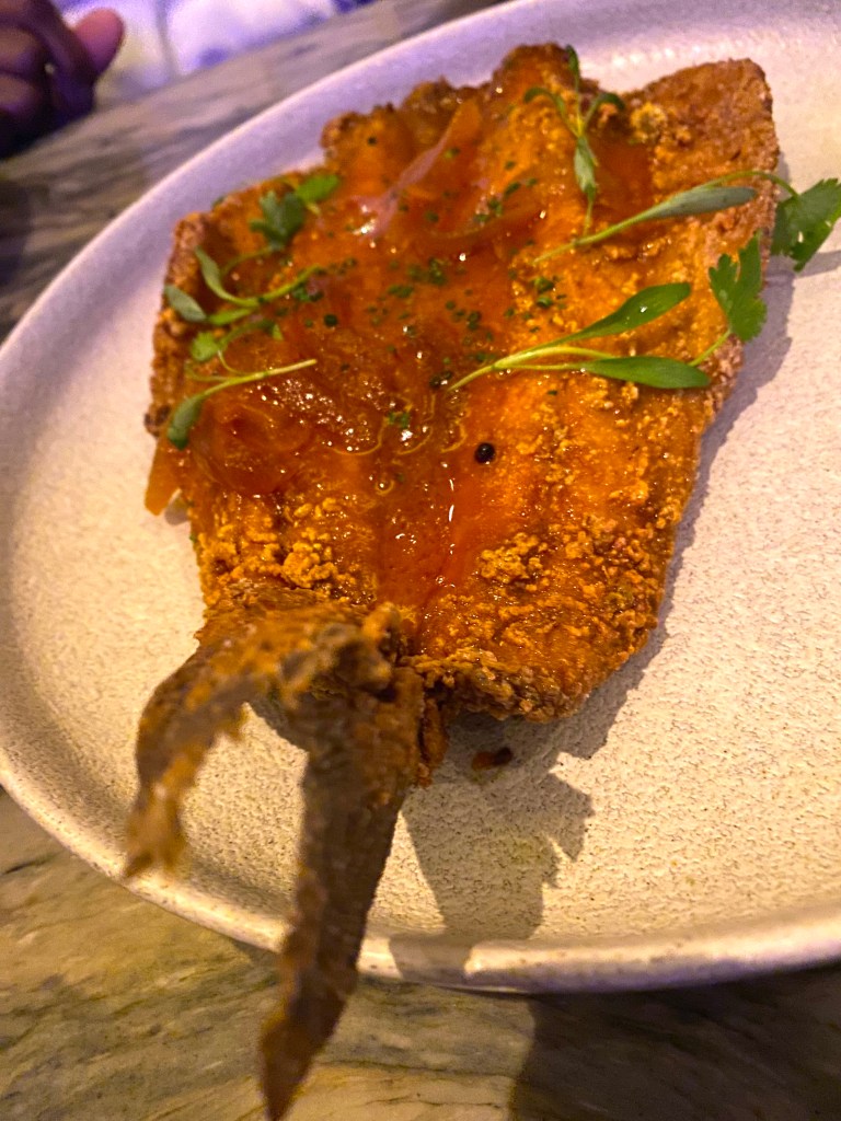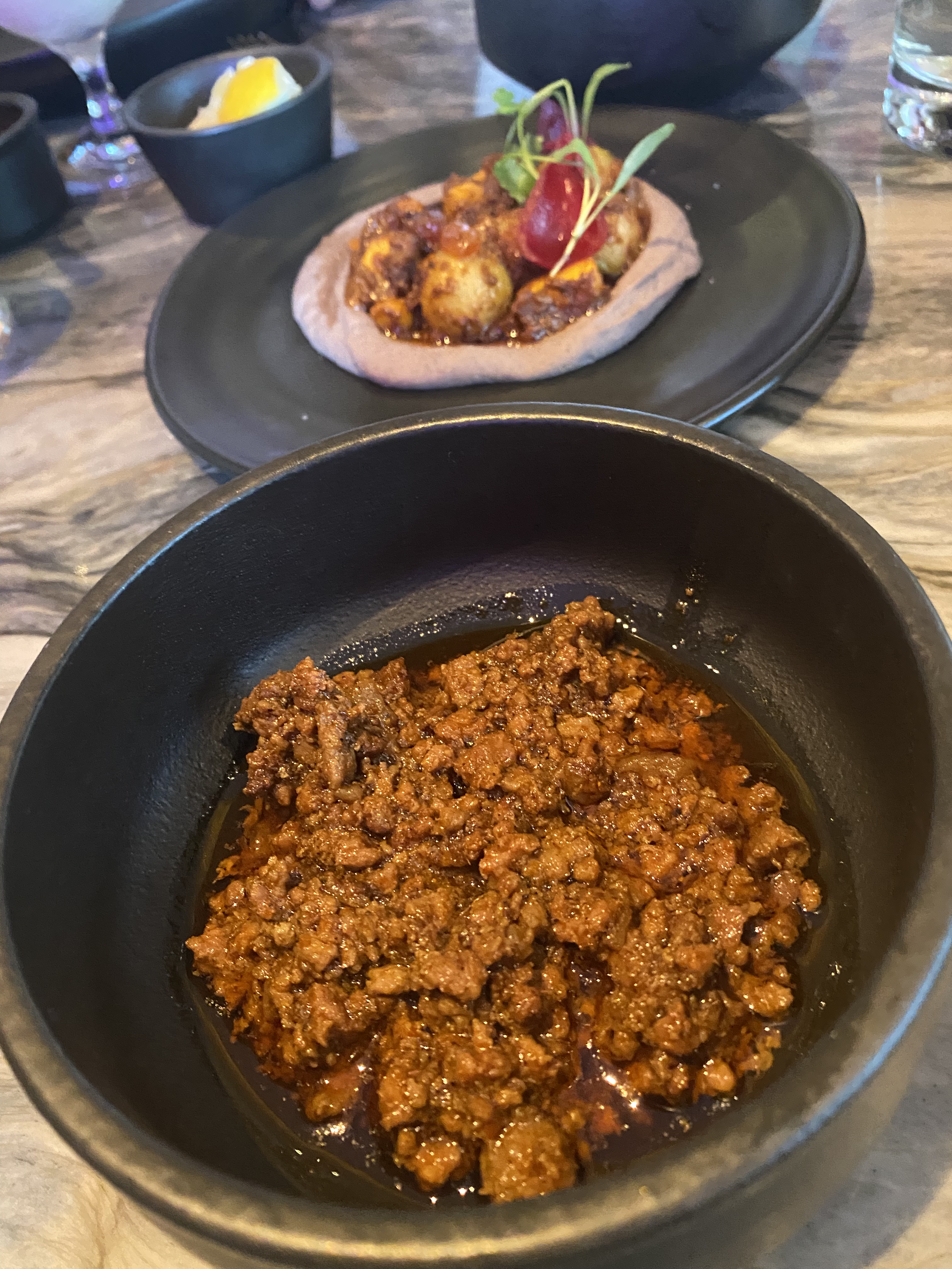 It’s a rich mouthfeel helped by also being stuffed and Jonah Crab, and served on a spoonful of red stew. Here is how Eater New York described the dish: