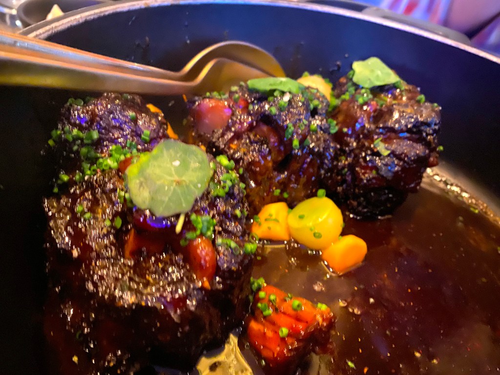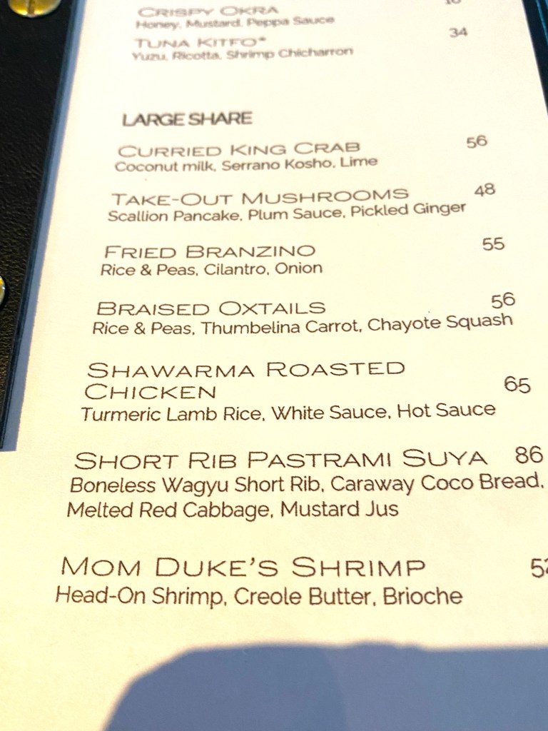 “I went for the dish with the biggest wow factor — the short rib pastrami suya ($70), both Nigerian and Jewish at the same time. It consisted of a monster wagyu beef rib cured like pastrami and snowed with the powdered spices of suya, the northern Nigerian preparation style. This platter was an entire meal, with sweet pickled purple cabbage that might have been sent over from a German restaurant, a mustard sauce, and a small skillet of four rolls described on the menu as coco bread that was utterly delicious.”