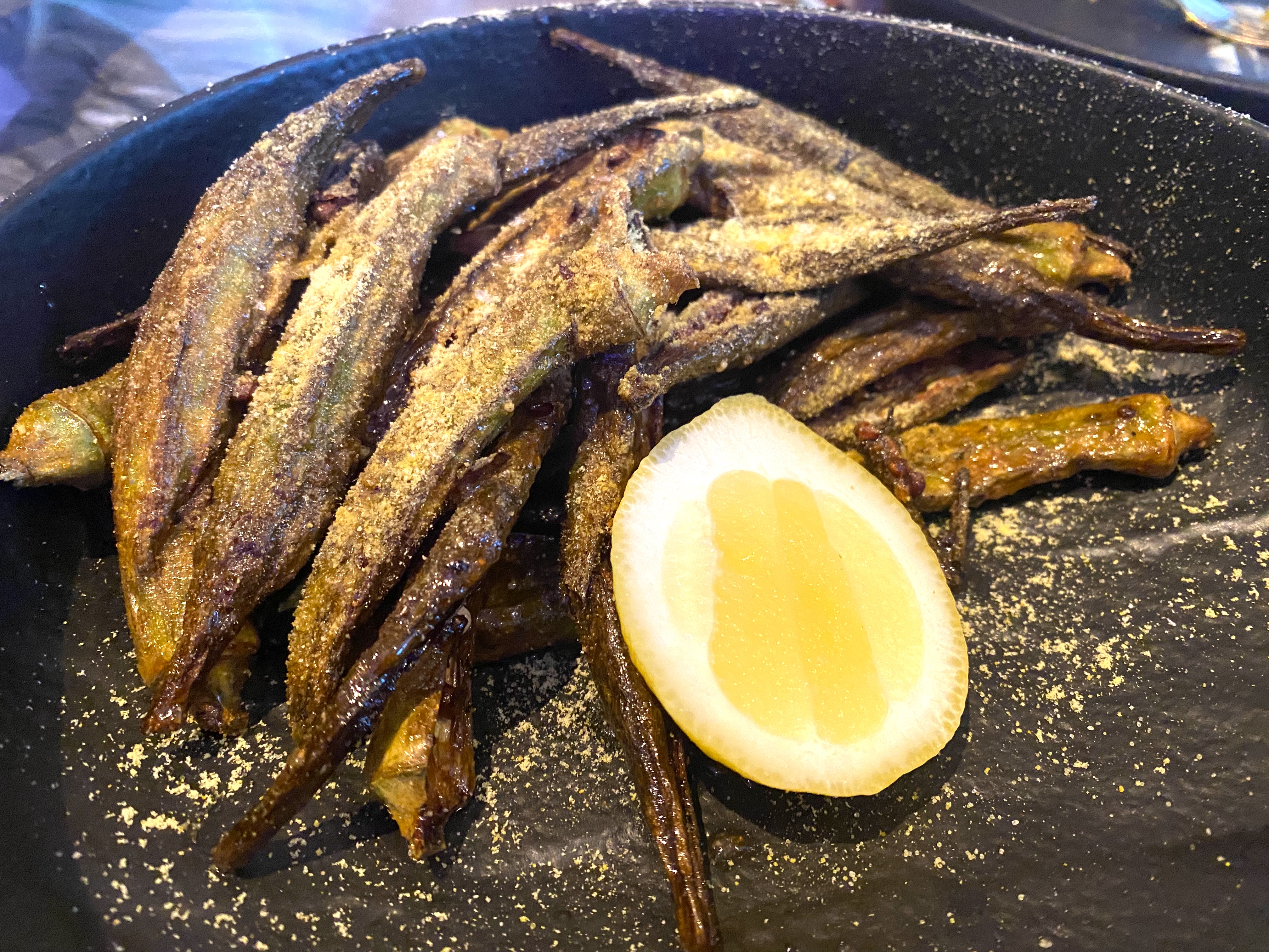 Along with the lemon wedge to squeeze over these fried Okra, there were three sauces to dip into as well, giving you three different tastes.