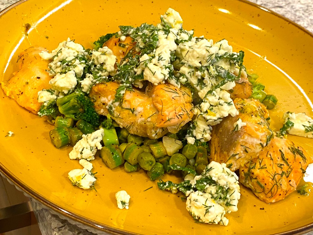 Thank you Georgia for posting this – a terrific recipe I couldn’t wait to make! It uses a bunch of green vegetables and green herbs with Feta to really help this Salmon pop!
