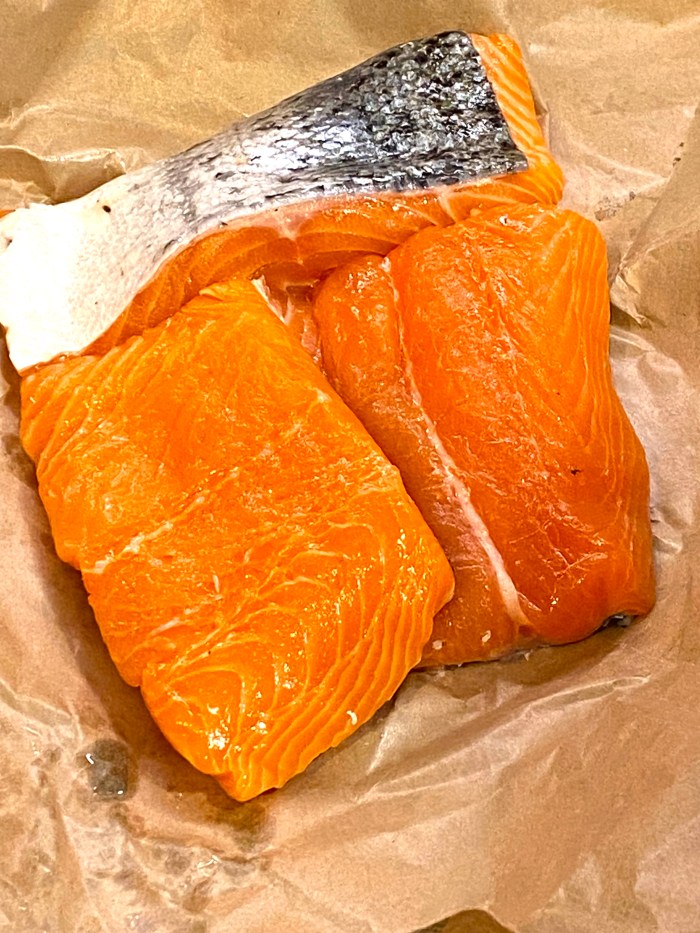 I took the salmon off the skin and cut it into chunks – but you can do it whole as well. Add the salmon fillets to a lined baking tray, drizzle with a little oil, salt, pepper and a squeeze of lemon, bake at 200 degrees for 8-10 minutes.