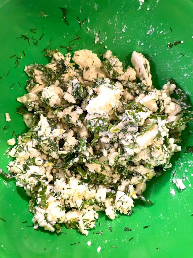 Dice the mint and dill and stir into the crumbled feta with a squeeze of lemon juice and the zest. Then set aside.