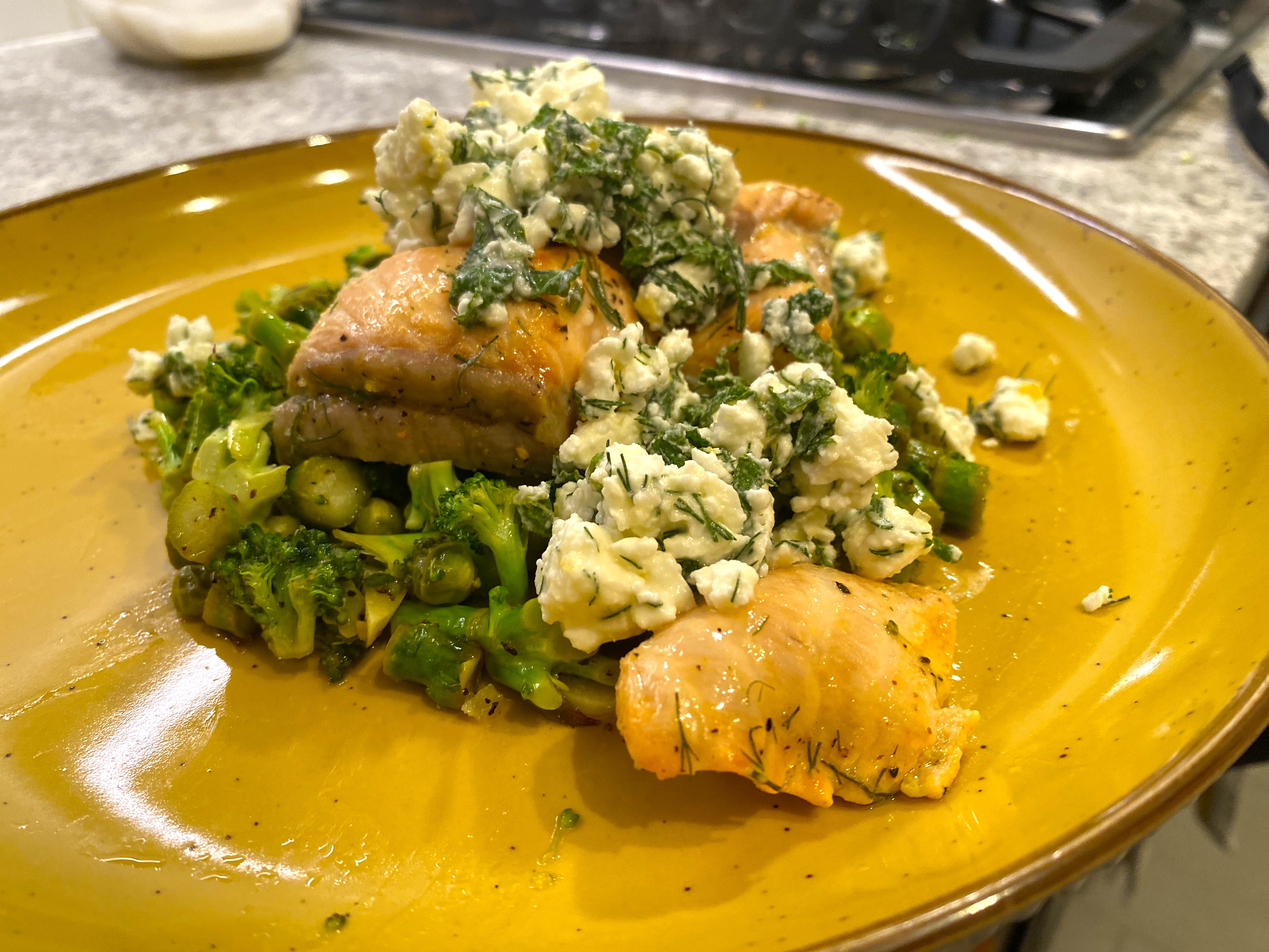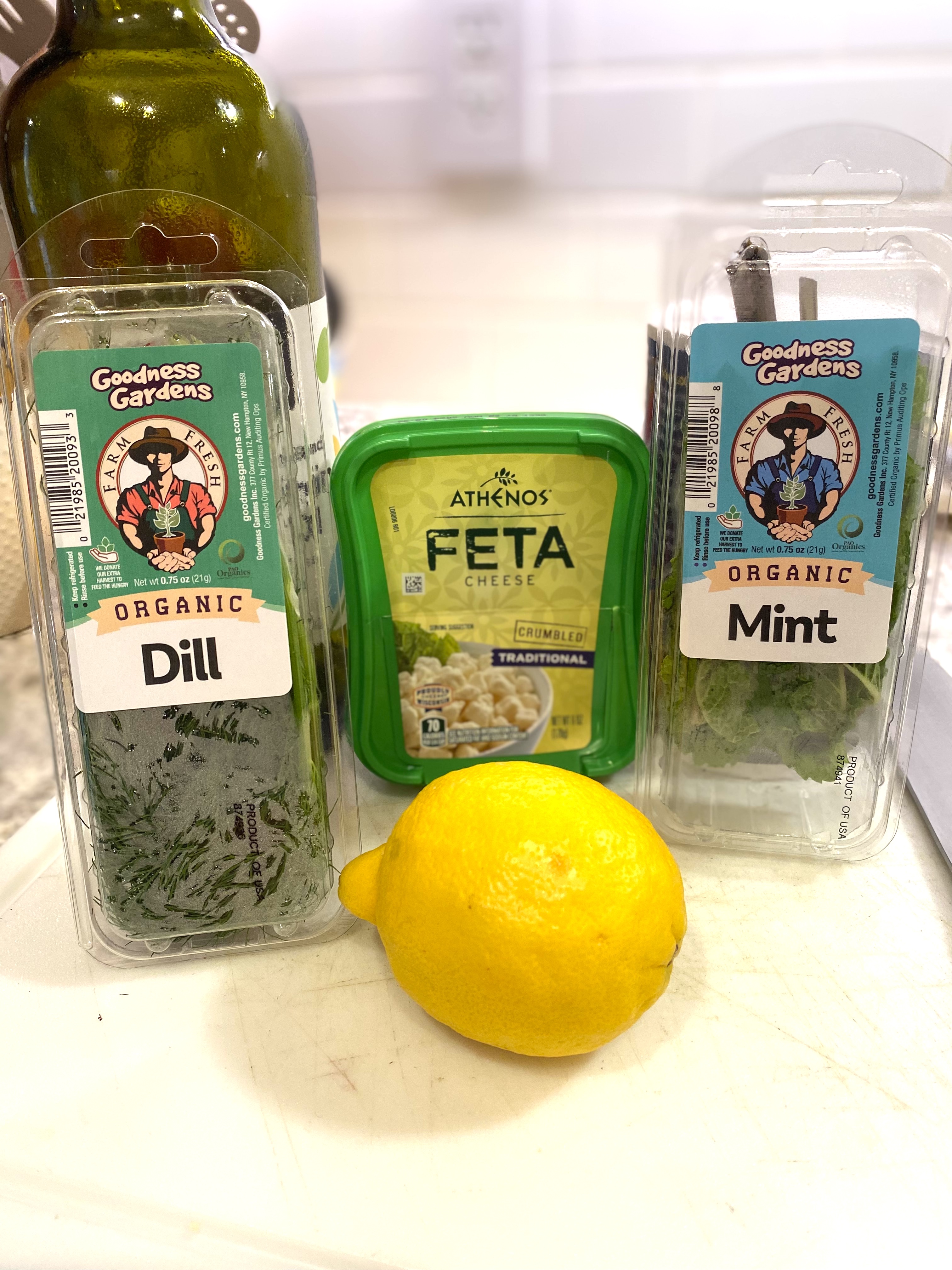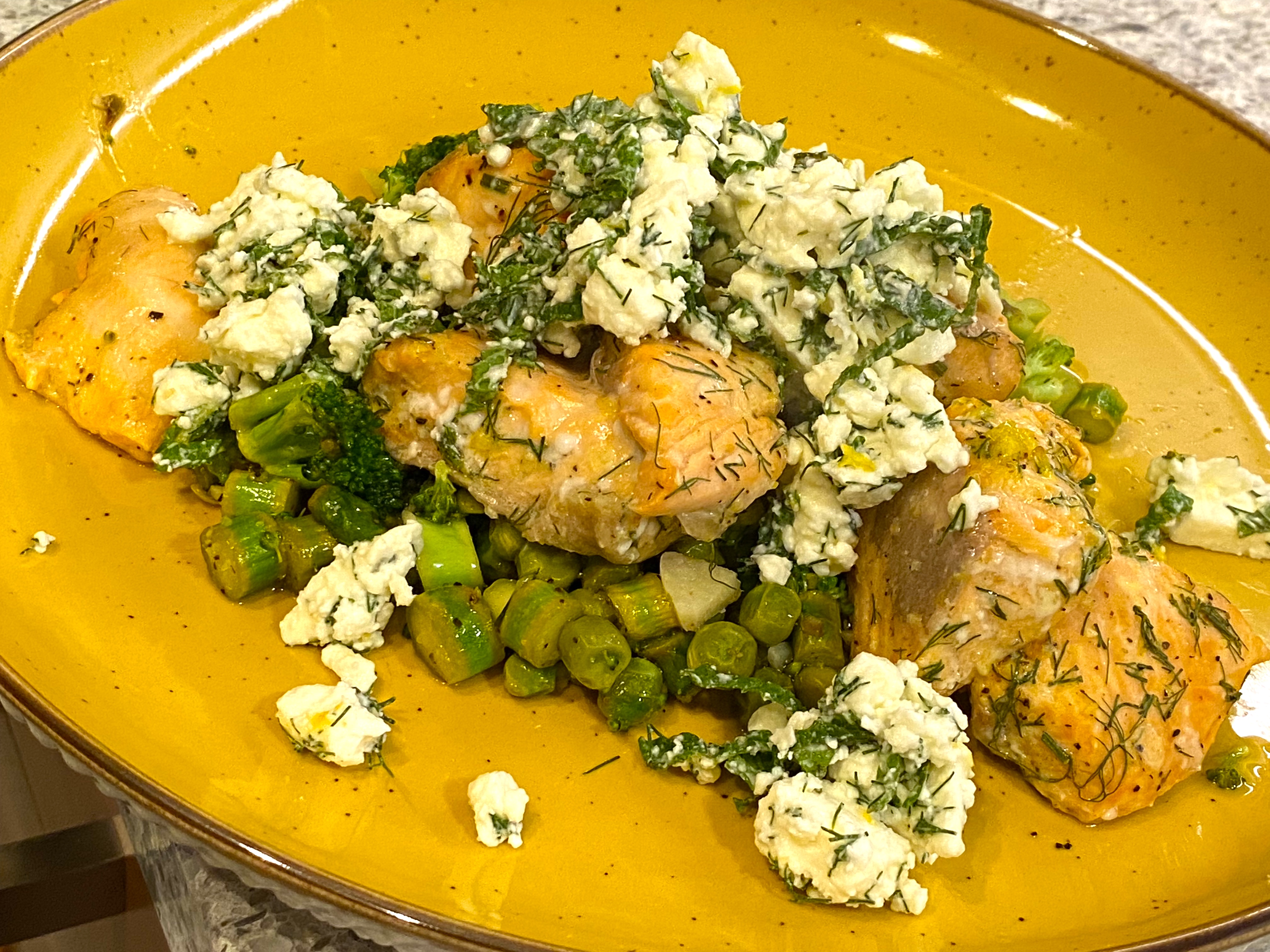 Thank you Georgia for posting this – a terrific recipe I couldn’t wait to make! It uses a bunch of green vegetables and green herbs with Feta to really help this Salmon pop!