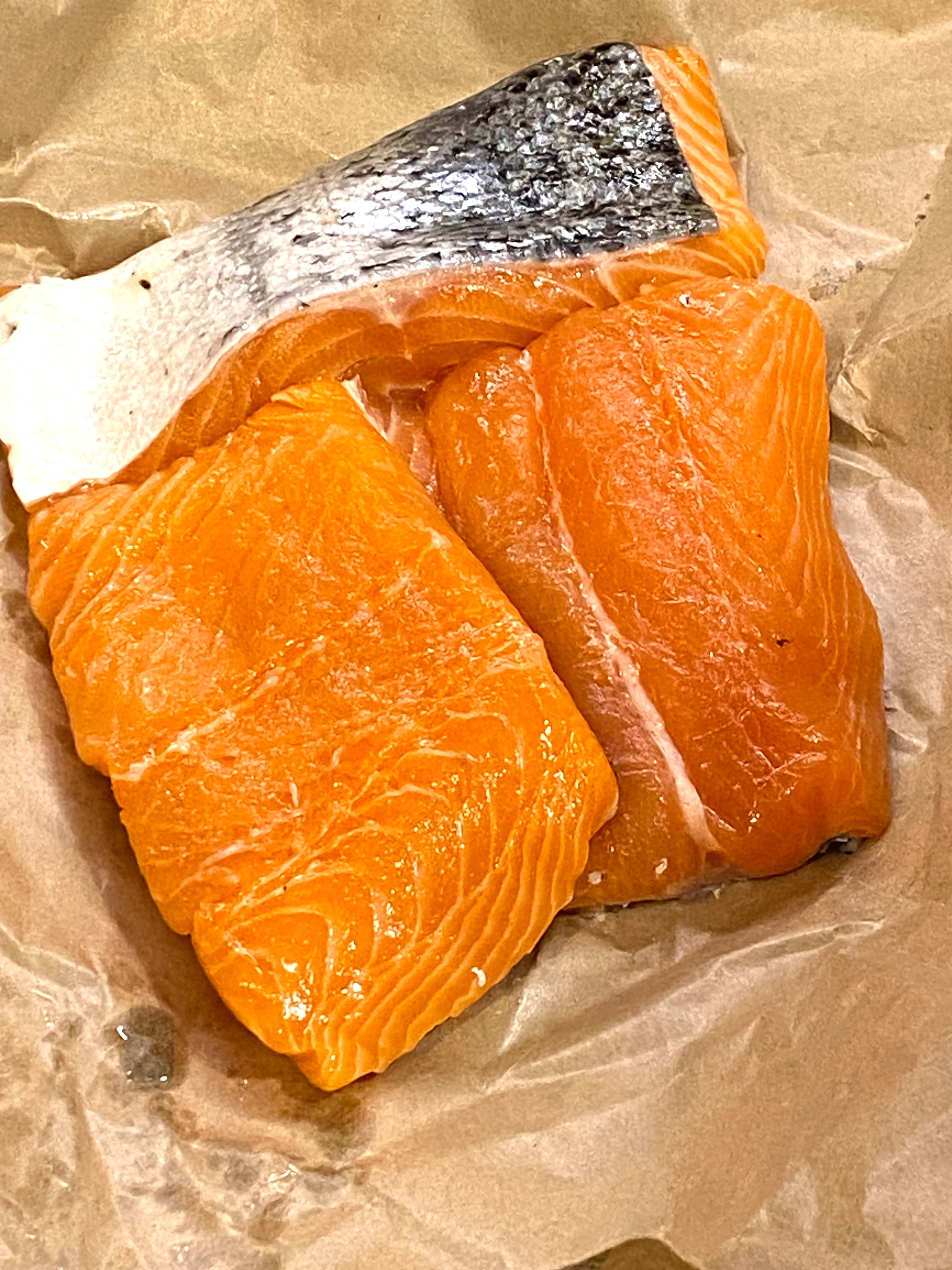I took the salmon off the skin and cut it into chunks – but you can do it whole as well. Add the salmon fillets to a lined baking tray, drizzle with a little oil, salt, pepper and a squeeze of lemon, bake at 200 degrees for 8-10 minutes.