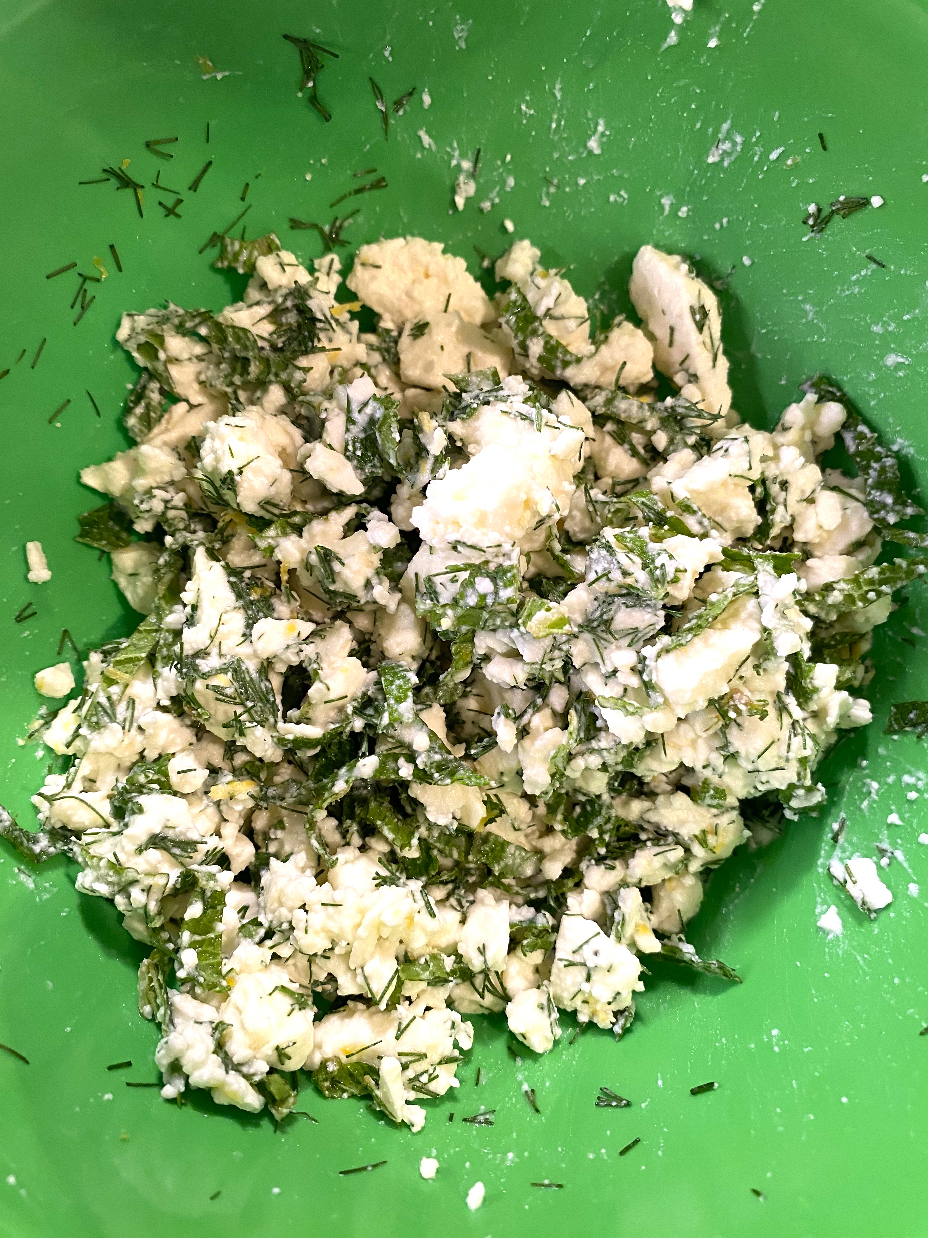 Dice the mint and dill and stir into the crumbled feta with a squeeze of lemon juice and the zest. Then set aside.